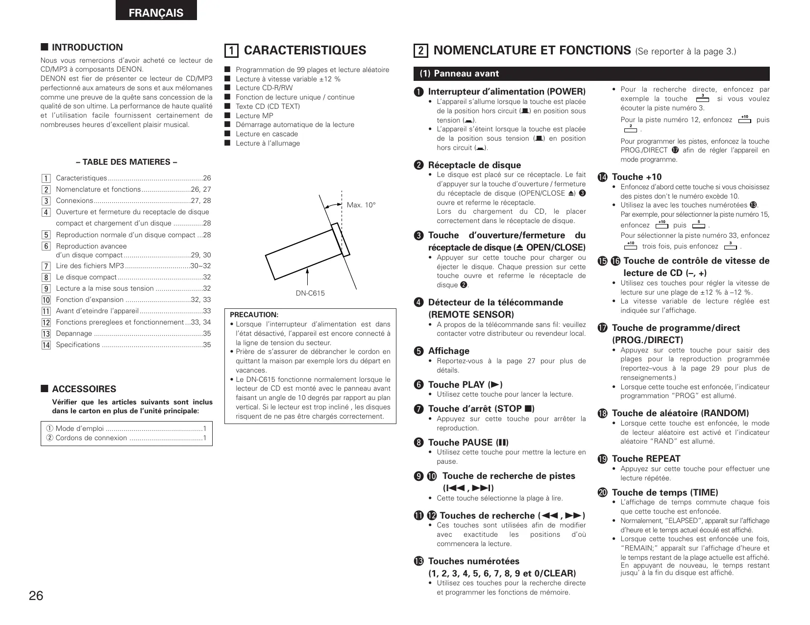 - Appuyer sur cette touche pour charger ou éjecter le disque. Chaque pression sur cette touche ouvre et referme le réceptacle de disque w. Le disque compact ...........................................32 Lecture a la mise sous tension ........................32 DN-C615 Fonction d’expansion .................................32, 33 Avant d’eteindre l’appareil ................................33 Fonctions prereglees et fonctionnement ...33, 34 Depannage .......................................................35 Specifications ...................................................35 2 ACCESSOIRES Vérifier que les articles suivants sont inclus dans le carton en plus de l’unité principale: q Mode d’emploi .................................................1 w Cordons de connexion .....................................1 PRECAUTION: