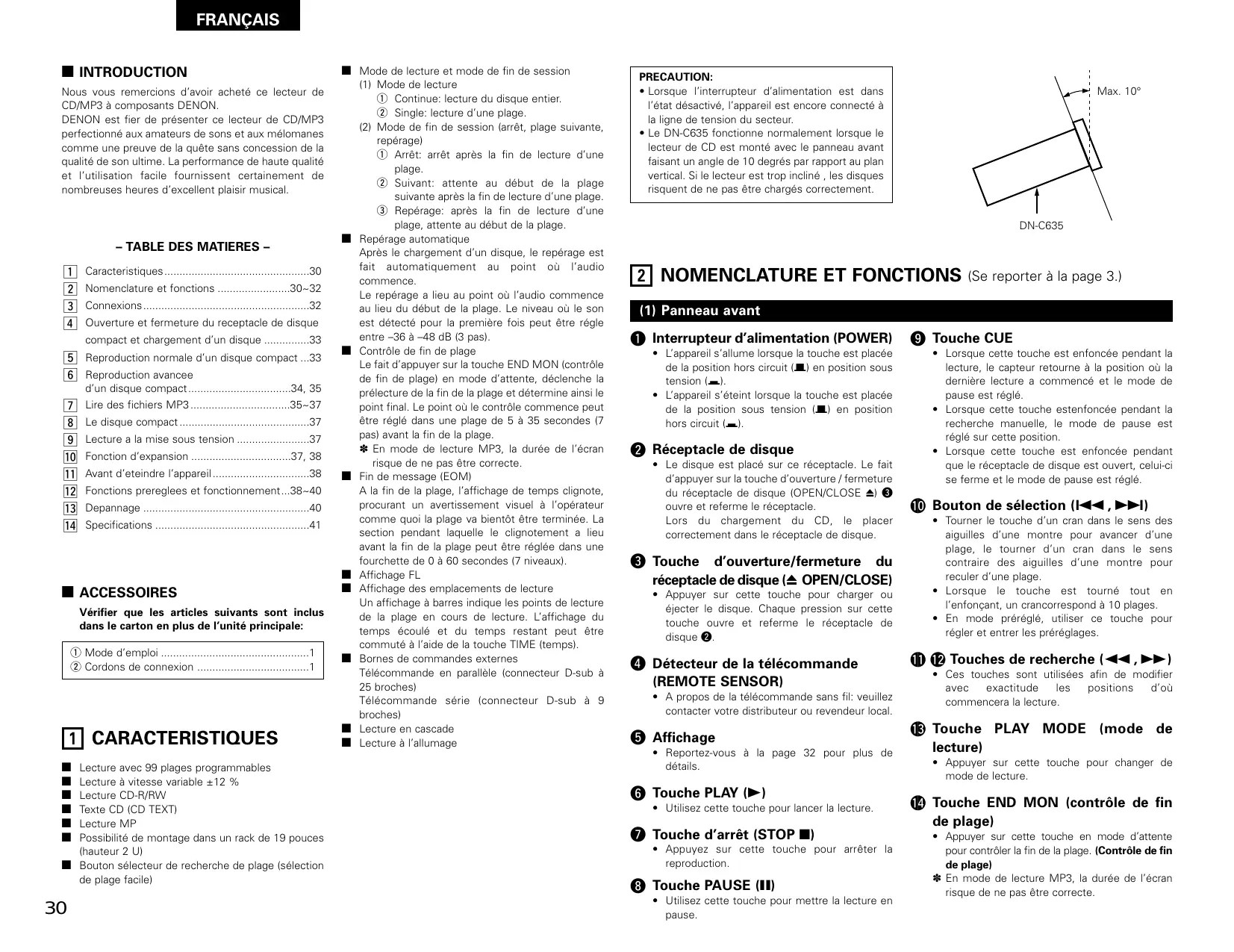 d’arrêt. Figure 2 DN-C635 Lorsque l’utilisation du lecteur CD est terminé, avant d’éteindre l’appareil, s’assurer que le réceptacle de disque a été fermé au moyen de la touche OPEN/CLOSE (5). ATTENTION: