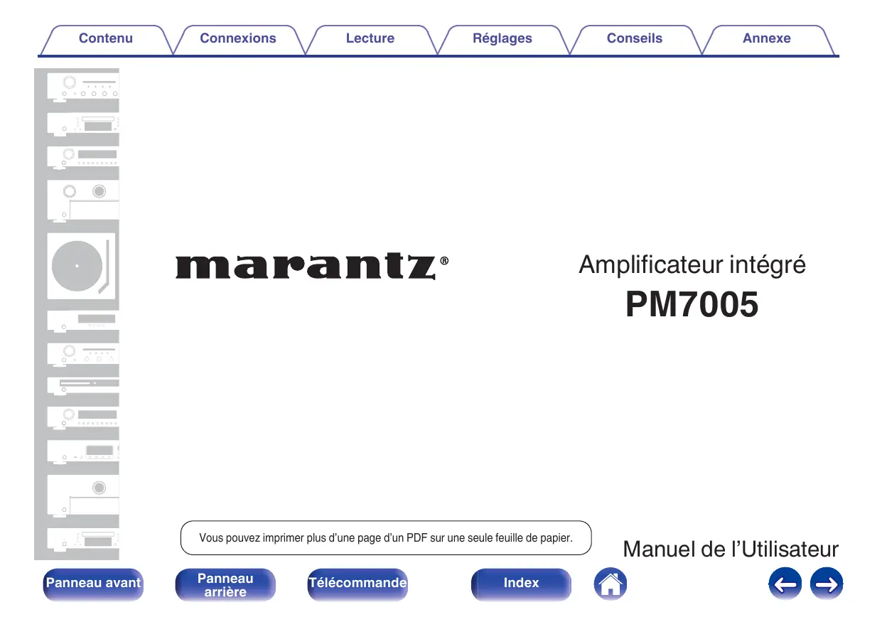 Contenu Connexions Lecture Réglages \/ Conseils \/ Annexe marantiz’: Amplificateur intégré == PM7005 ( Vous pouvez imprimer plus d'une page d'un PDF sur une seule feuille de papier. ) Manuel de l’Utilisateur CES | Panneau avant panneau Télécommande] [A e (>) arrière