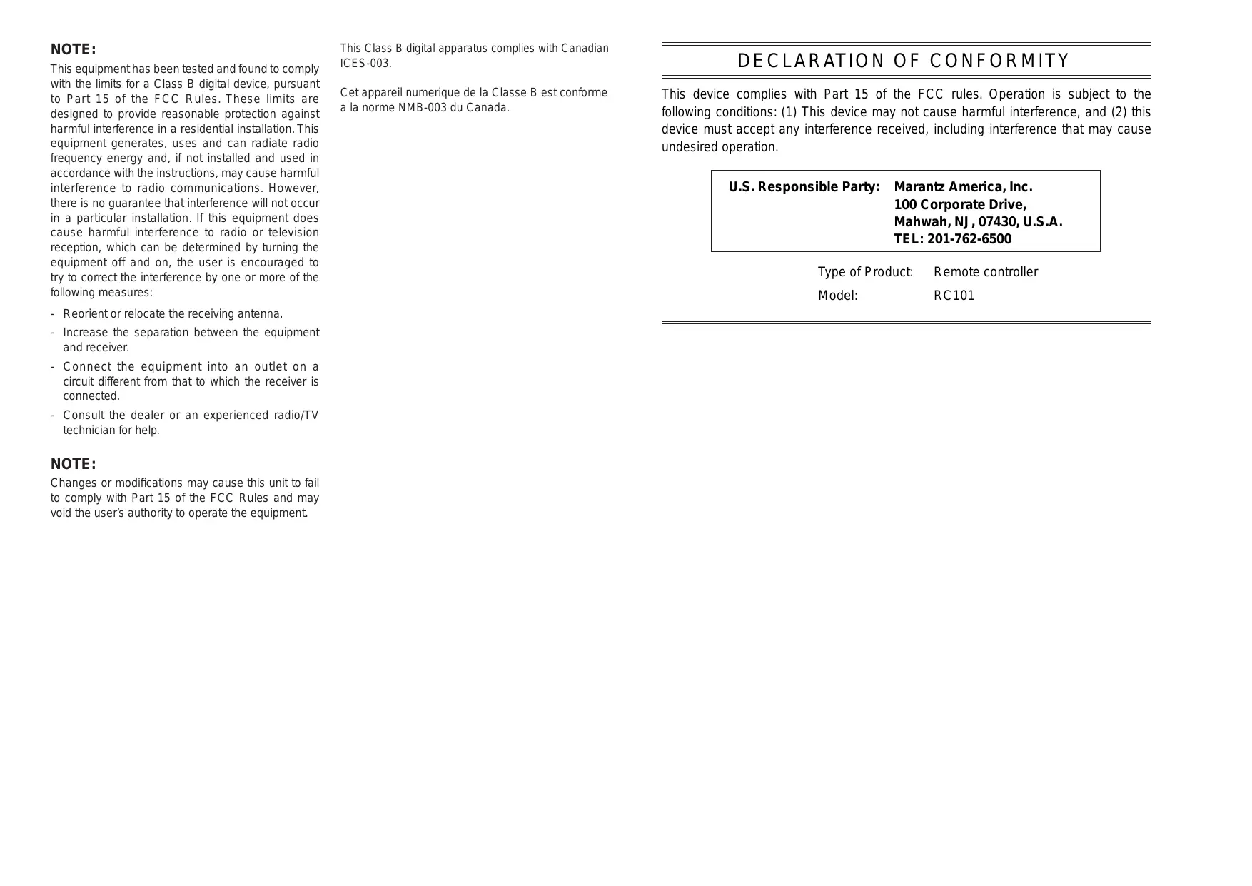 L'attestation d'achat est la preuve permanente d'un achat de valeur. La conserver en lieu sur pour s'y reporter aux fins d'obtention d'une couverture d'assurance ou dans le cadre de correspondances avec Marantz. IMPORTANT Pour l'obtention d'un service couvert parla garanti, i incombe au client d'établir la preuve de l'achat et d'en corroborer la date. Le reçu ou la facture constituent des preuves suffisantes. DEUTSCH GARANTIE Bei Garantiefragen wenden Sie sich bitte an Ihren Marantz-Händler.