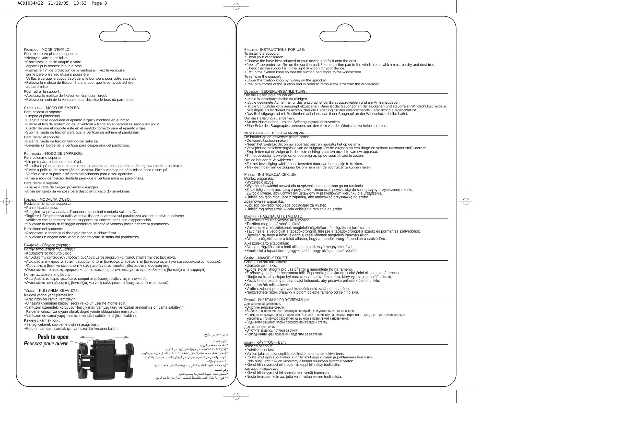 + Retirez le film de protection de la ventouse. Fixez la ventouse sur le pare-brise sec et sans poussière. Veillez à ce que le support soit dans le bon sens pour votre appareil. * Relevez la molette de fixation à crans pour que la ventouse adhère au pare-brise. Pour retirer le support * Abaissez la molette de fixation en tirant sur l'ergot. + Relevez un coin de la ventouse pour décollez le bras du pare-brise.