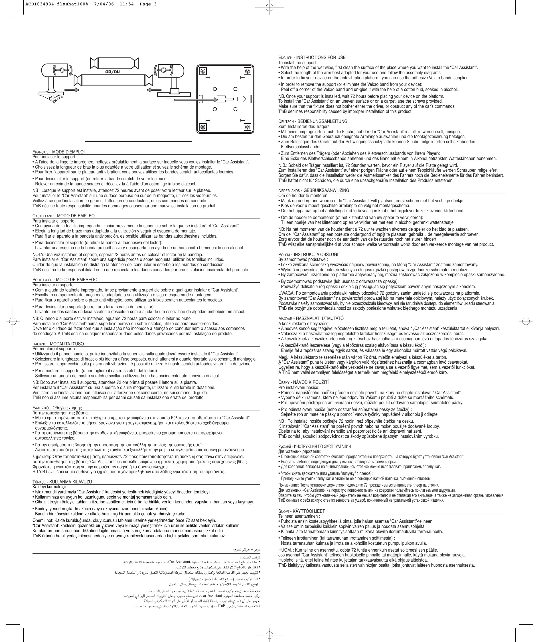 • Pour désinstaller le support (ou retirer la bande scratch de votre lecteur) : Relever un coin de la bande scratch et décollez-la à l’aide d’un coton tige imbibé d’alcool. NB : Lorsque le support est installé, attendez 72 heures avant de poser votre lecteur sur le plateau. Pour installer le “Car Assistant” sur une surface poreuse ou sur de la moquette, utilisez les vis fournies. Veillez à ce que l’installation ne gêne ni l’attention du conducteur, ni les commandes de conduite. T’nB décline toute responsabilité pour les dommages causés par une mauvaise installation du produit.