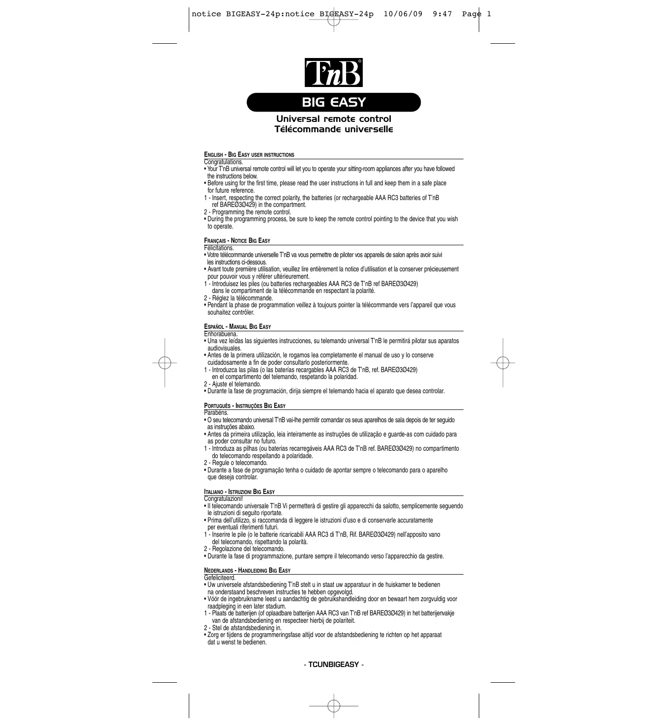 BIG EASY - Télécommande universelle TNB - Notice d'utilisation et mode d'emploi gratuit