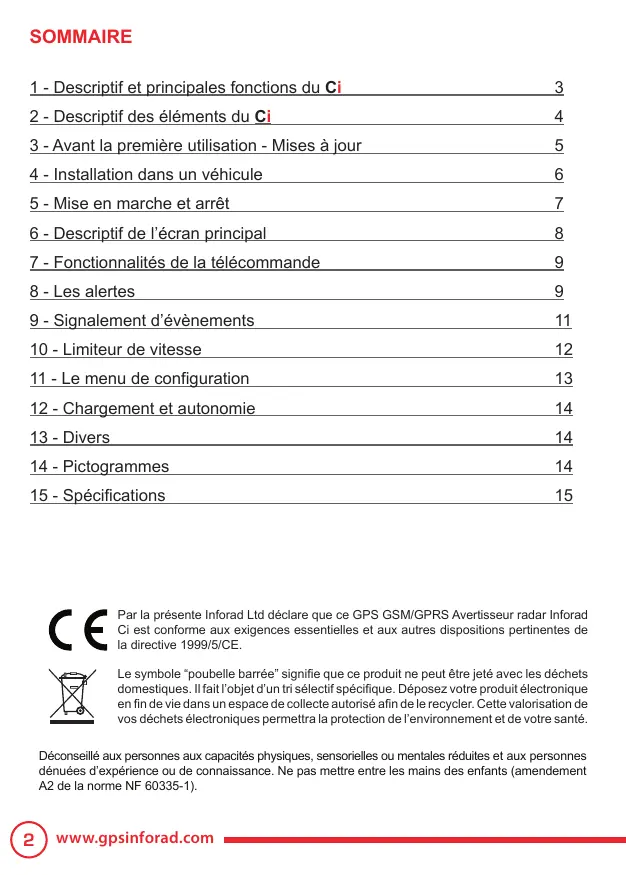 Par la présente Inforad Ltd déclare que ce GPS GSM/GPRS Avertisseur radar Inforad Ci est conforme aux exigences essentielles et aux autres dispositions pertinentes de la directive 1999/5/CE. Le symbole “poubelle barrée” signifie que ce produit ne peut être jeté avec les déchets domestiques. Il fait l’objet d’un tri sélectif spécifique. Déposez votre produit électronique en fin de vie dans un espace de collecte autorisé afin de le recycler. Cette valorisation de vos déchets électroniques permettra la protection de l’environnement et de votre santé. Déconseillé aux personnes aux capacités physiques, sensorielles ou mentales réduites et aux personnes dénuées d’expérience ou de connaissance. Ne pas mettre entre les mains des enfants (amendement A2 de la norme NF 60335-1).