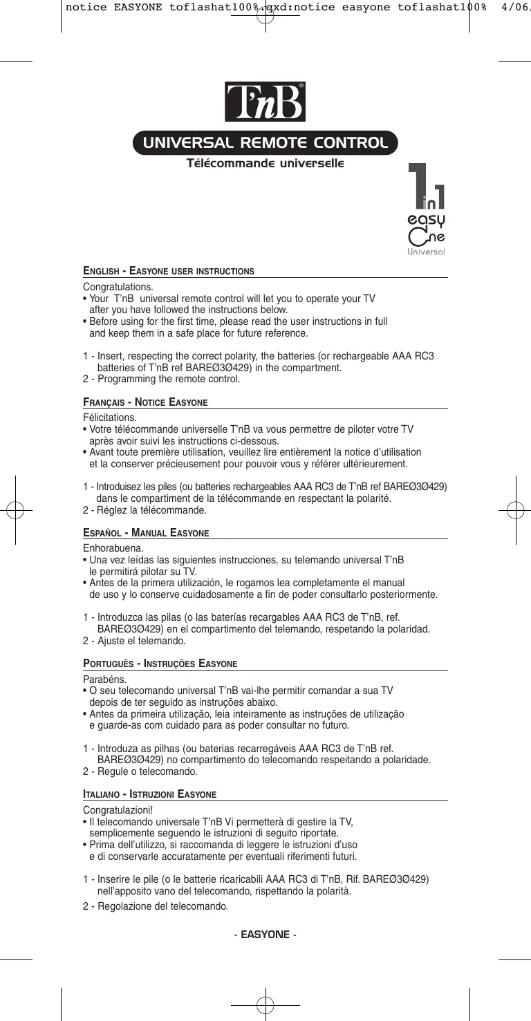 FRANÇAIS - NonicE EASYONE Félicitations. + Votre télécommande universelle TnB va vous permettre de piloter votre TV après avoir suivi les instructions ci-dessous. + Avant toute première utlisation, veuillez lire entièrement la notice d'utilisation et la conserver précieusement pour pouvoir vous y référer ultérieurement. 1 -Introduisez les piles (ou batteries rechargeables AAA RC3 de TnB ref BAREO30429) dans le compartiment de la télécommande en respectant la polarité. 2 -Réglez la télécommande. EspañoL + MANUAL EASYONE Enhorabuena. + Una vez leidas las siguientes instrucciones, su telemando universal T'nB le permiträ pilotar su TV. + Antes de la primera utiizaciôn, le rogamos lea completamente el manual de uso y lo conserve cuidadosamente a fin de poder consultarlo posteriormente.