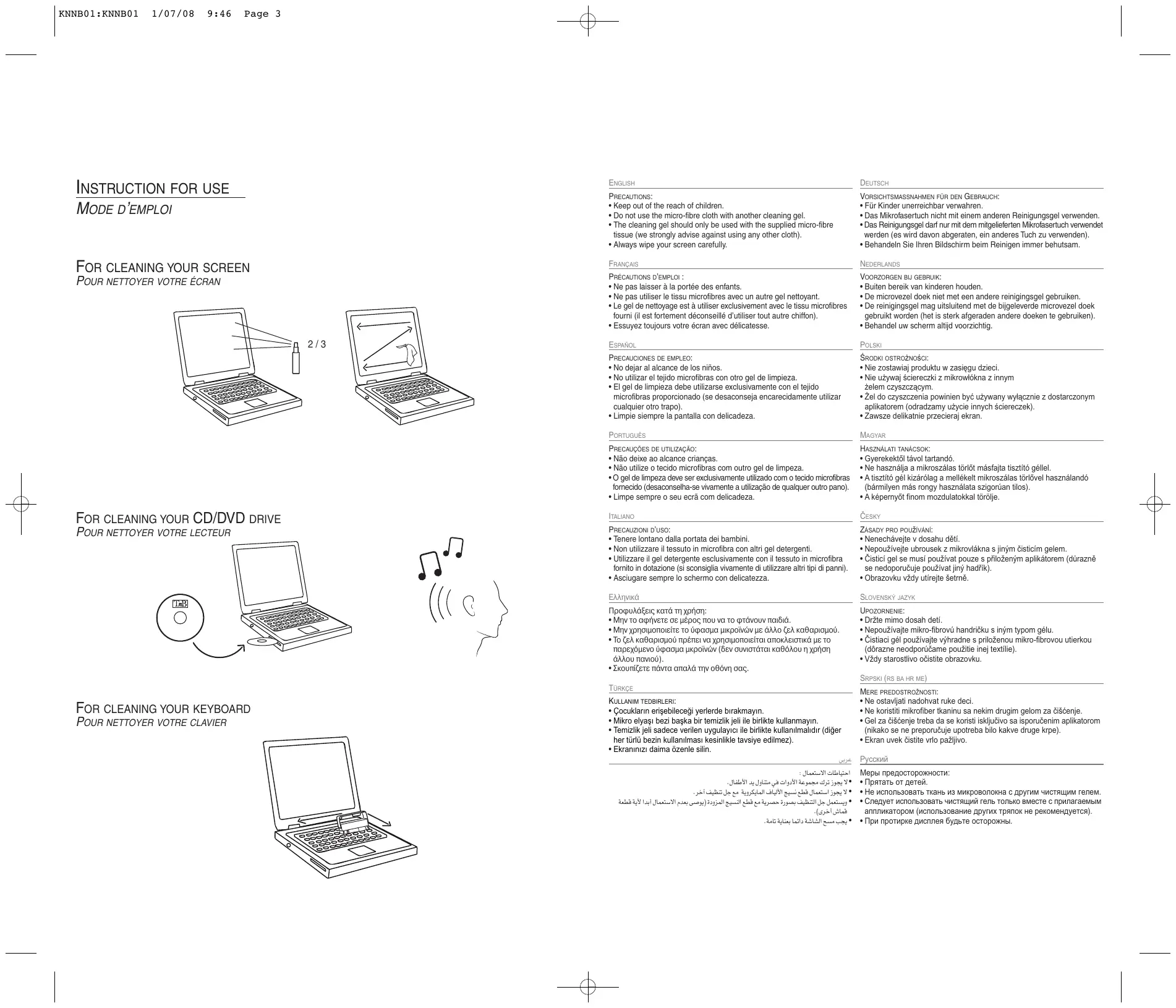 - Le gel de nettoyage est à utiliser exclusivement avec le tissu microfibrés fourni (il est fortement déconseillé d'utiliser tout autre chiffon).