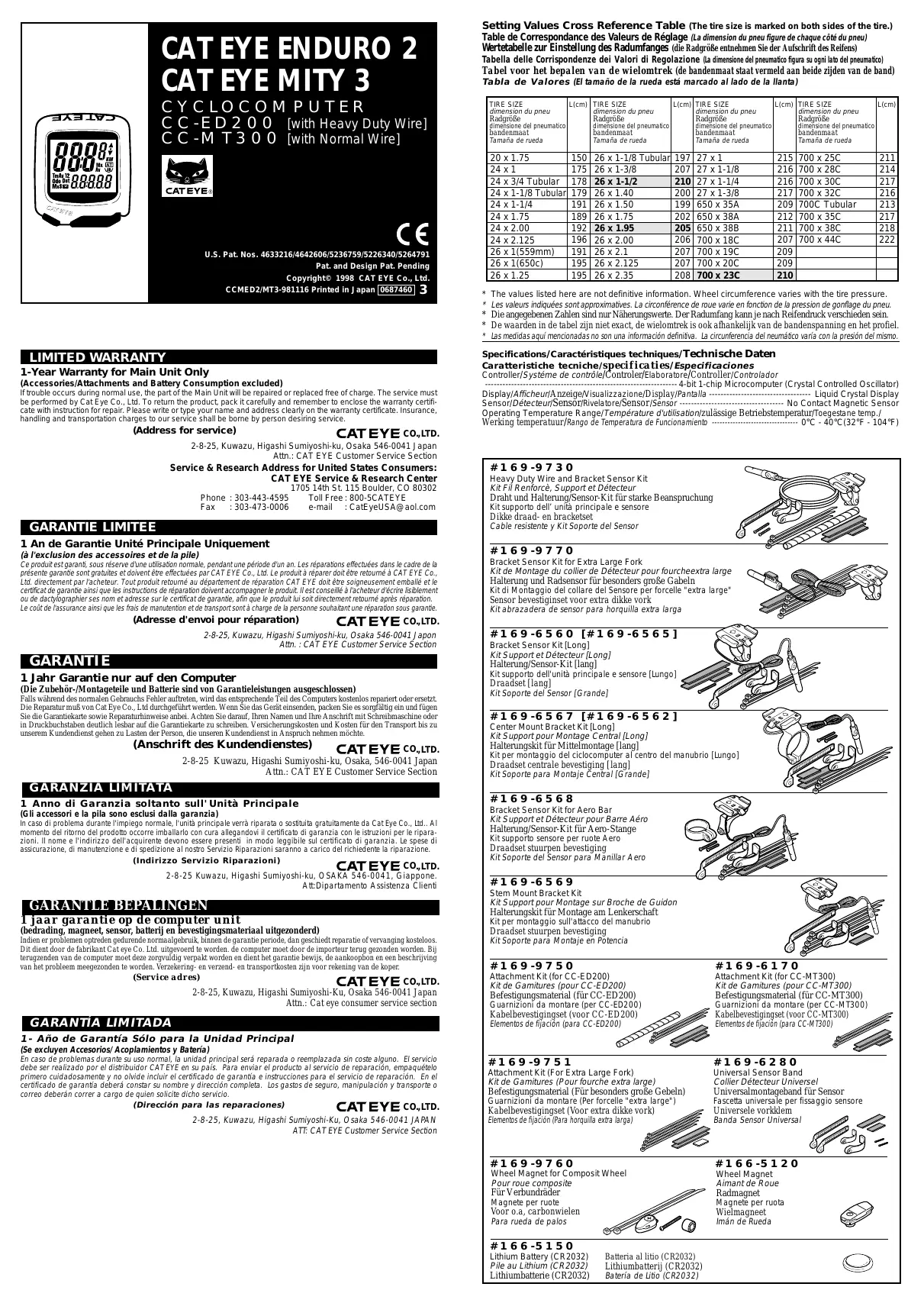 Ce produit est garantie, sous réserve d'une utilisation normale, pendant une période d'un an. Les réparations effectuées dans le cadre de la présente garantie sont gratuites et doivent être effectuées par CAT EYE Co., Ltd. Le produit à réparer doit être retourné à CAT EYE Co., Ltd. directement par l'acheteur. Tout produit retourné au département de réparation CAT EYE doit être soigneusement emballé et le certificat de garantie ainsi que les instructions de réparation doivent accompagner le produit. Il est conseillé à l'acheteur d'écrire lisiblement ou de dactylographier son nom et adresse sur le certificat de garantie, afin que le produit lui soit directement retourné après réparation. Le coût d'assurance ainsi que les frais de maintenance et de transport sont à charge de la personne suivant une réparation sous garantie.