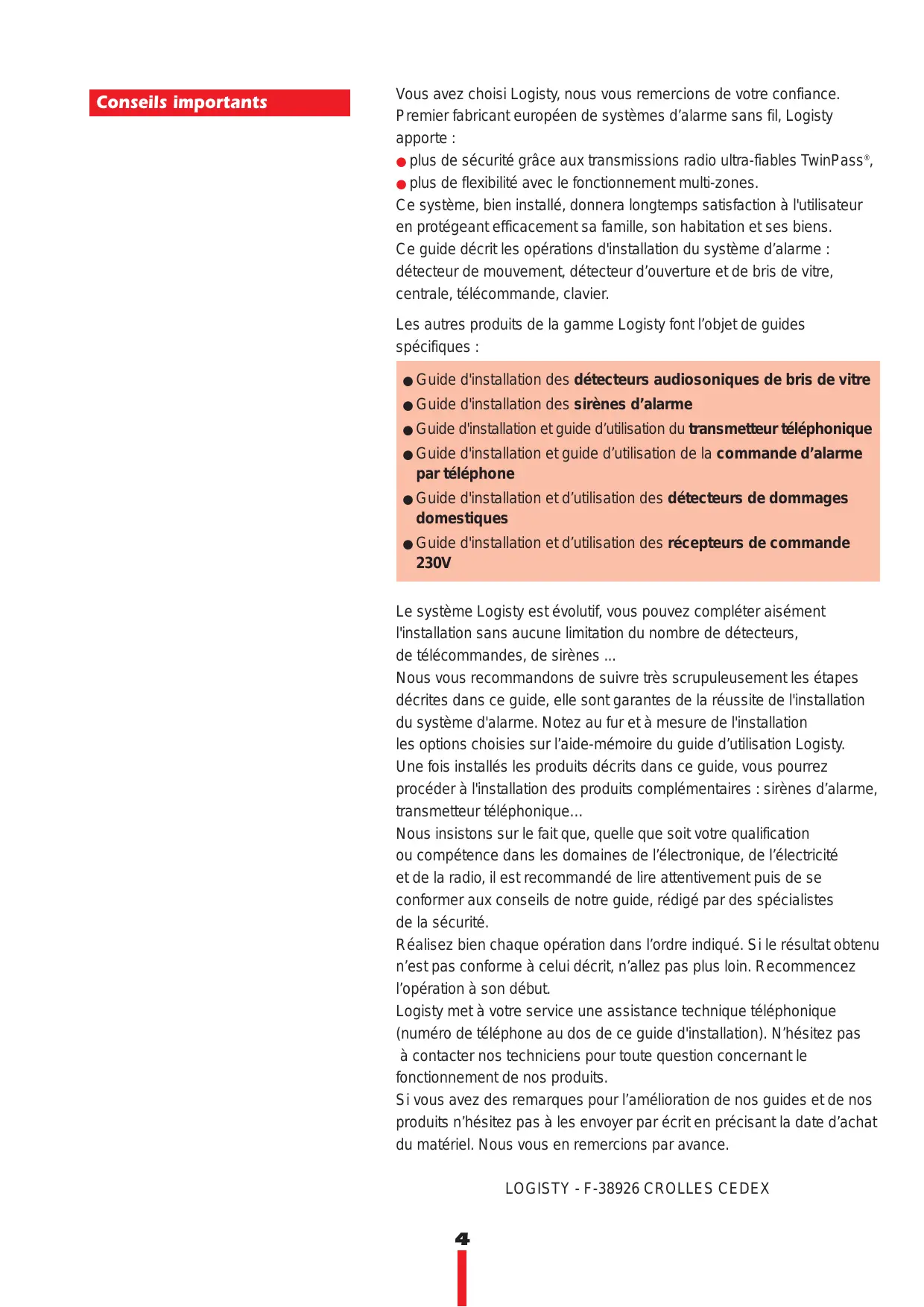 Nous vous recommendons de suivre très scrupuleusement les étapes décrites dans ce guide, elle sont garantes de la réussite de l'installation du système d'alarme. Notez au fur et à mesure de l'installation les options choisises sur l'aide-mémoire du guide d'utilisation Logisty. Une fois installés les produits décrits dans ce guide, vous pourrez partager à l'installation des produits complémentaires : sirènes d'alarme, transmetteur téléphonique...