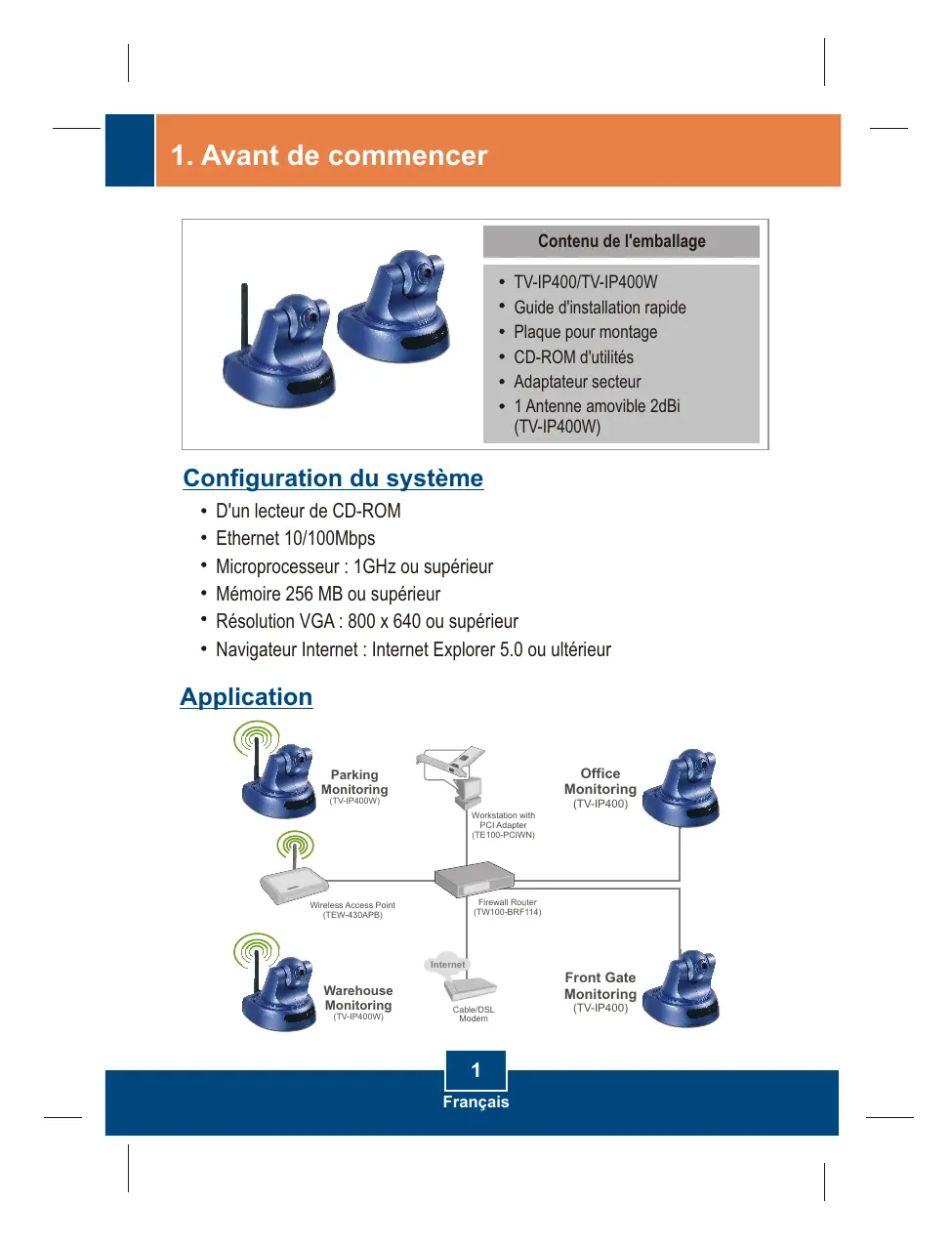 Contenu de l'emballage TV-IP400/TV-IP400W Guide d'installation rapide Plaque pour montage CD-ROM d'utilités Adaptateur secteur 1 Antenne amovible 2dBi (TV-IP400W) Configuration du système D'un lecteur de CD-ROM Ethernet 10/100Mbps Microprocesseur : 1GHz ou supérieur Mémoire 256 MB ou supérieur Résolution VGA : 800 x 640 ou supérieur Navigateur Internet : Internet Explorer 5.0 ou ultérieur Application Office Monitoring Parking Monitoring (TV-IP400W) (TV-IP400) Workstation with PCI Adapter (TE100-PCIWN) Firewall Router (TW100-BRF114) Wireless Access Point (TEW-430APB) Internet Warehouse Monitoring (TV-IP400W) Front Gate Monitoring Cable/DSL Modem
