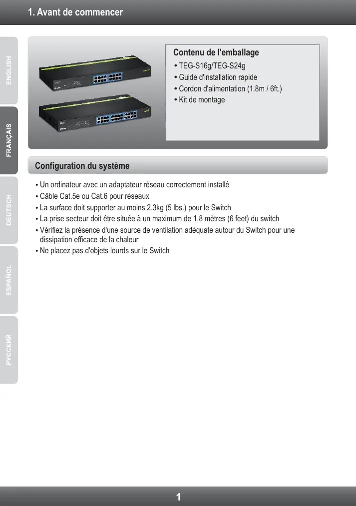 Configuration du système ŸUn ordinateur avec un adaptateur réseau correctement installé ŸCâble Cat.5e ou Cat.6 pour réseaux ŸLa surface doit supporter au moins 2.3kg (5 lbs.) pour le Switch ŸLa prise secteur doit être située à un maximum de 1,8 mètres (6 feet) du switch ŸVérifiez la présence d'une source de ventilation adéquate autour du Switch pour une