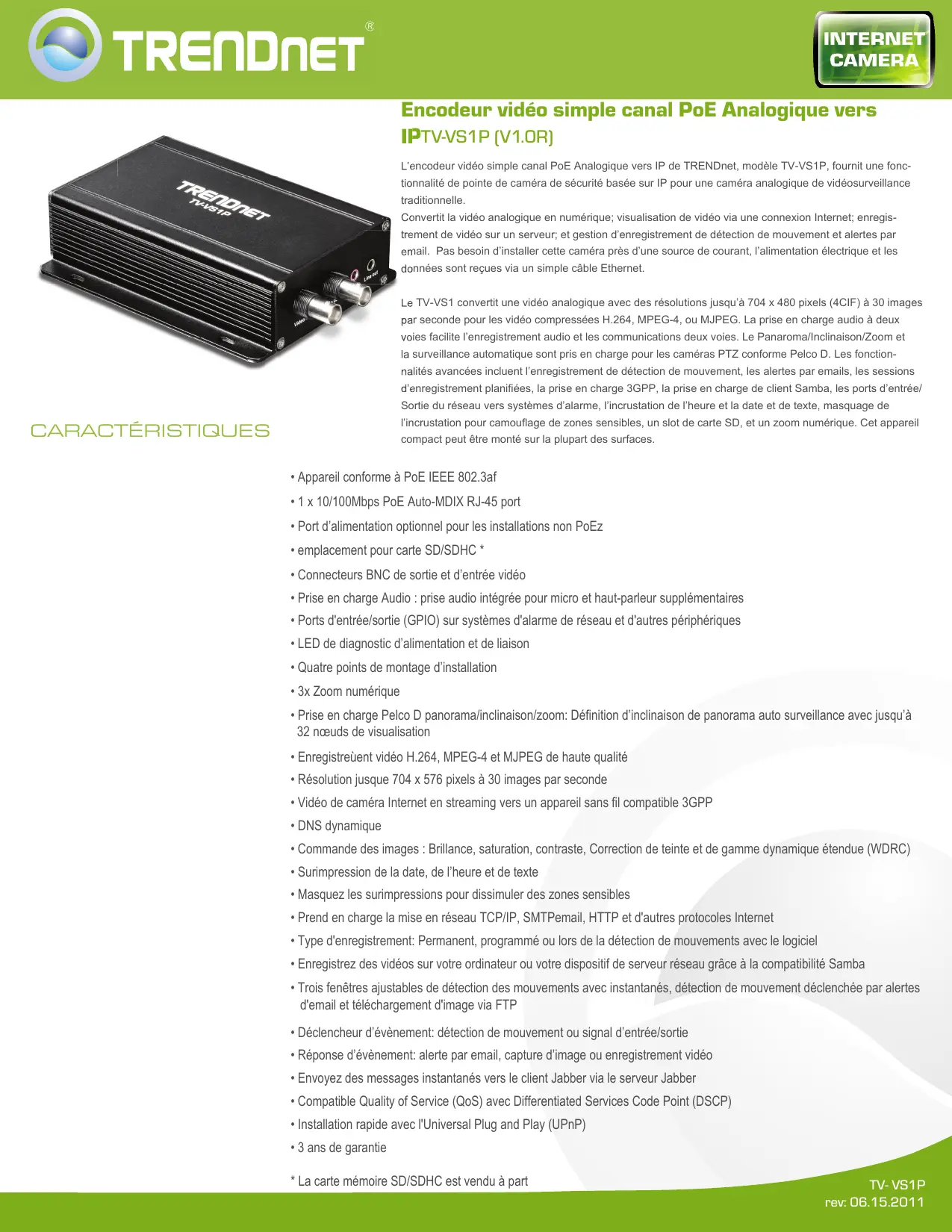 TRENDNET HE CARACTÉRISTIQUES Encodeur vidéo simple canal PoE Analogique vers IPTVVS1P (V1.0R) L'encodeur vidéo simple canal PoE Analogique vers IP de TRENDnet, modèle TV-VS1P, fournit une fonc- tionnalité de pointe de caméra de sécurité basée sur IP pour une caméra analogique de vidéosurveillance traditionnelle. Convert la vidéo analogique en numérique; visualisation de vidéo via une connexion Internet, enregis- trement de vidéo sur un serveur, et gestion d'enregistrement de détection de mouvement et alertes par email. Pas besoin d'installer cette caméra près d'une source de courant, l'alimentation électrique et les données sont reçues via un simple câble Ethernet. Le TV-VS1 convertit une vidéo analogique avec des résolutions jusqu'à 704 x 480 pixels (ACIF) à 30 images par seconde pour les vidéo compressées H.264, MPEG-4, ou MJPEG. La prise en charge audio à deux voies facilite l'enregistrement audio et les communications deux voies. Le Panaroma/inclinaison/Zoom et la surveillance automatique sont pris en charge pour les caméras PTZ conforme Pelco D. Les fonction nalités avancées incluent l'enregistrement de détection de mouvement, les alertes par emails, les sessions d'enregistrement planifiées, la prise en charge 3GPP, la prise en charge de client Samba, les ports d'entrée/ Sortie du réseau vers systèmes d'alarme, l'incrustation de l'heure et la date et de texte, masquage de l'incrustation pour camouflage de zones sensibles, un slot de carte SD, et un zoom numérique. Cet appareil compact peut être monté sur la plupart des surfaces. + Appareil conforme à POE IEEE 802.3af + 1x 10/100Mbps PoE Auto-MDIX RJ-45 port + Port d'alimentation optionnel pour les installations non PoEz + emplacement pour carte SD/SDHC * + Connecteurs BNC de sortie et d'entrée vidéo + Prise en charge Audio : prise audio intégrée pour micro et haut-parleur supplémentaires + Ports d'entrée/sortie (GPIO) sur systèmes d'alarme de réseau et d'autres périphériques + LED de diagnostic d'alimentation et de liaison + Quatre points de montage d'installation + 3x Zoom numérique + Prise en charge Pelco D panorama/inclinaison/zoom: Définition d'inclinaison de panorama auto surveillance avec jusqu'à 32 nœuds de visualisation + Enregistreüent vidéo H.264, MPEG-4 et MJPEG de haute qualité + Résolution jusque 704 x 576 pixels à 30 images par seconde + Vidéo de caméra Internet en streaming vers un appareil sans fil compatible 3GPP + DNS dynamique + Commande des images : Brillance, saturation, contraste, Correction de teinte et de gamme dynamique étendue (WDRC) + Surimpression de la date, de l'heure et de texte + Masquez les surimpressions pour dissimuler des zones sensibles + Prend en charge la mise en réseau TCP/IP, SMTPemail, HTTP et d'autres protocoles Internet + Type d'enregistrement: Permanent, programmé ou lors de la détection de mouvements avec le logiciel + Enregistrez des vidéos sur votre ordinateur ou votre dispositif de serveur réseau grâce à la compatibilité Samba + Trois fenêtres ajustables de détection des mouvements avec instantanés, détection de mouvement déclenchée par alertes d'email et téléchargement d'image via FTP + Déclencheur d'évènement: détection de mouvement ou signal d'entrée/sortie + Réponse d'évènement: alerte par email, capture d'image ou enregistrement vidéo + Envoyez des messages instantanés vers le client Jabber via le serveur Jabber + Compatible Quality of Service (QoS) avec Differentiated Services Code Point (DSCP) + Installation rapide avec l'Universal Plug and Play (UPnP) + 3 ans de garantie