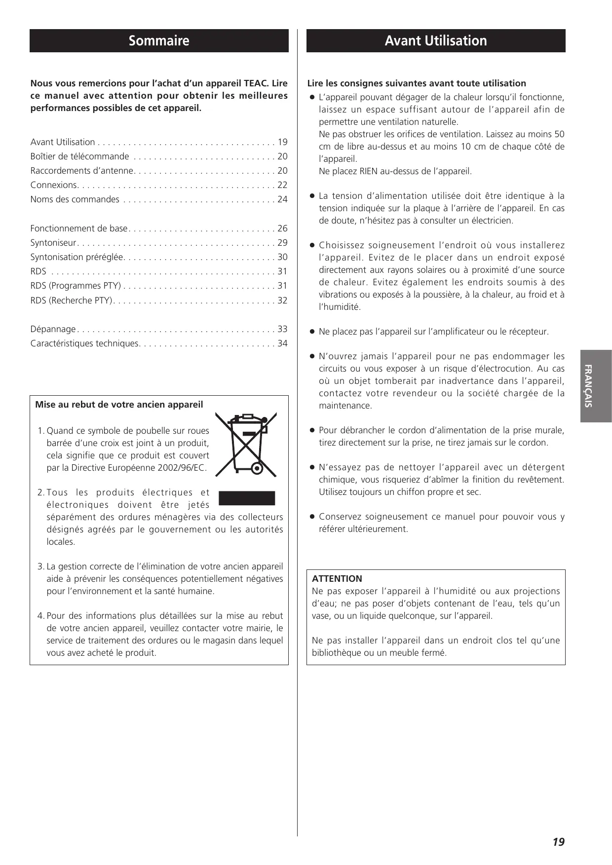 Nous vous remercions pour l’achat d’un appareil TEAC. Lire ce manuel avec attention pour obtenir les meilleures performances possibles de cet appareil.