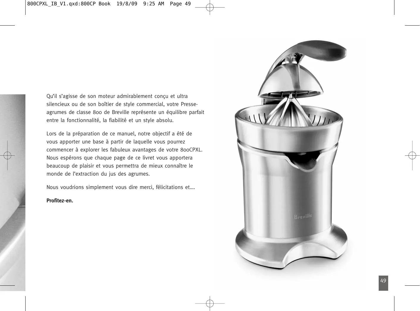 800CPXL_IB_V1.qxd:800CP Book 19/8/09 9:25 AM Page 49 e Qu'il s'agisse de son moteur admirablement conçu et ultra silencieux ou de son boîtier de style commercial, votre Presse- agrumes de classe 800 de Breville représente un équilibre parfait entre la fonctionnalité, la fiabilité et un style absolu. Lors de la préparation de ce manuel, notre objectif a été de vous apporter une base à partir de laquelle vous pourrez commencer à explorer les fabuleux avantages de votre 800CPXL. Nous espérons que chaque page de ce livret vous apportera beaucoup de plaisir et vous permettra de mieux connaître le monde de l'extraction du jus des agrumes. Nous voudrions simplement vous dire merci, félicitations et... Profitez-en.