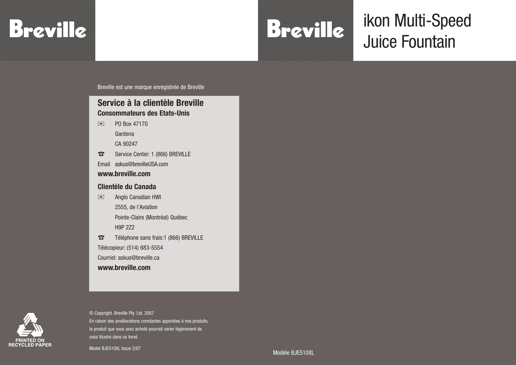 Téléphone sans frais:1 (866) BREVILLE Télécopieur: (514) 683-5554 Courriel: askus@breville.ca www.breville.com © Copyright. Breville Pty. Ltd. 2007 En raison des améliorations constantes apportées à nos produits, le produit que vous avez acheté pourrait varier légèrement de celui illustré dans ce livret. Model BJE510XL Issue 2/07 Modèle BJE510XL Table des matières Page Breville vous recommande la sécurité avant tout