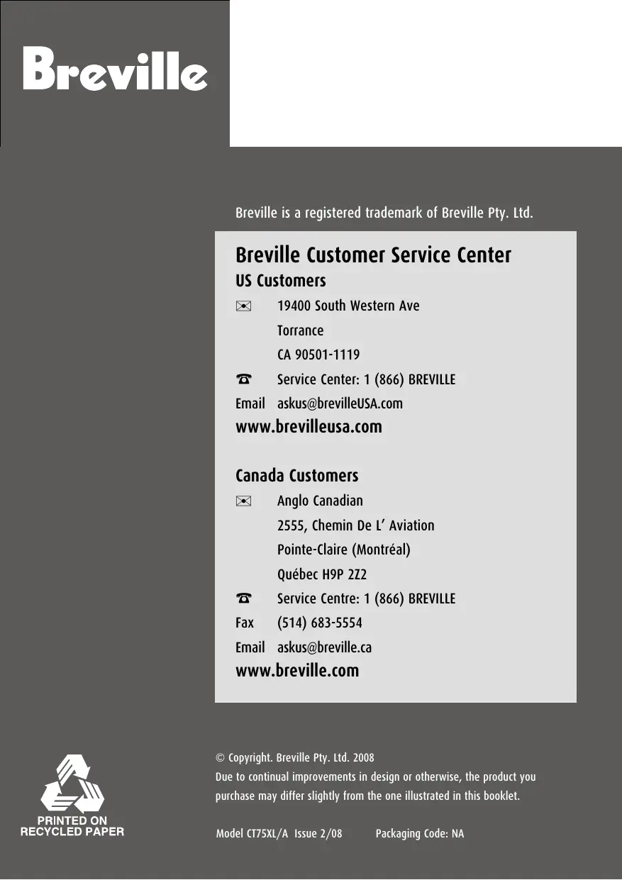 PRINTED ON RECYCLED PAPER Breville est une marque enregistrée de Breville