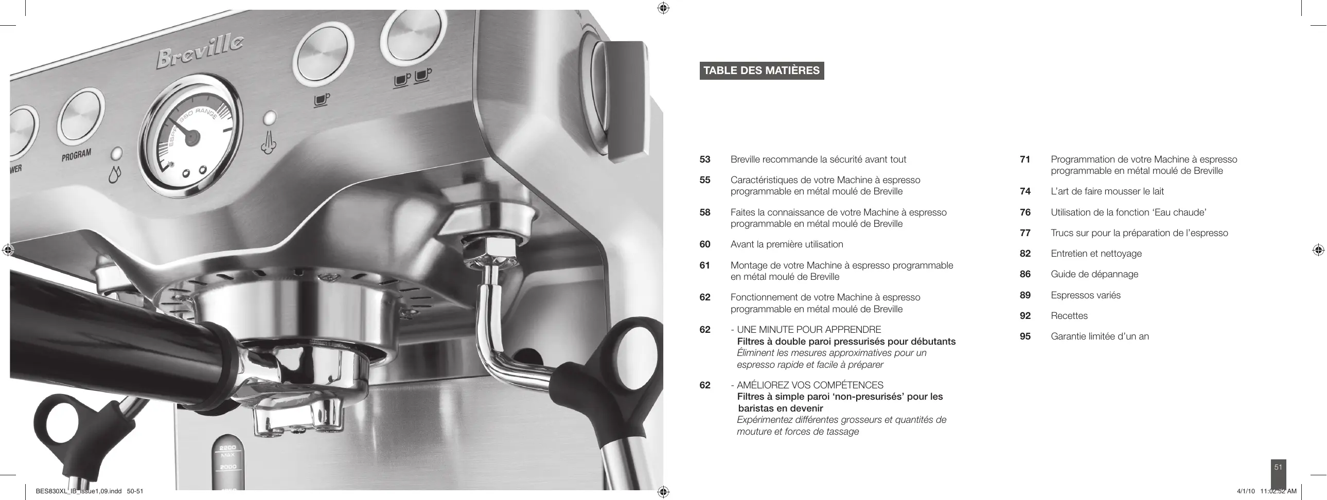 Breville recommande la sécurité avant tout Caractéristiques de votre Machine à espresso programmable en métal moulé de Breville Faites la connaissance de votre Machine à espresso programmable en métal moulé de Breville Avant la première utilisation Montage de votre Machine à espresso programmable en métal moulé de Breville Fonctionnement de votre Machine à espresso programmable en métal moulé de Breville