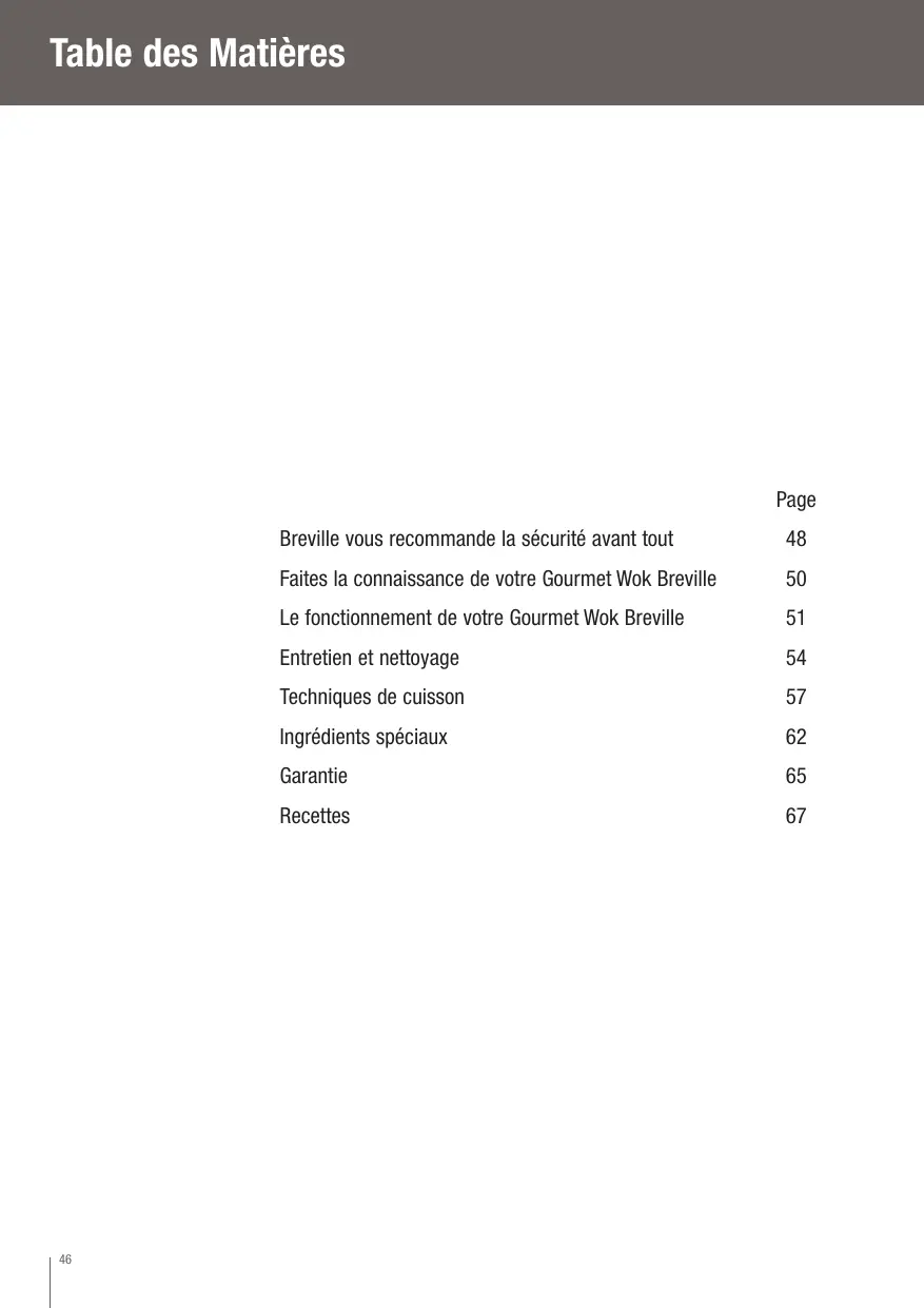 Table des Matières Page Breville vous recommande la sécurité avant tout 48 Faites la connaissance de votre Gourmet Wok Breville 50 Le fonctionnement de votre Gourmet Wok Breville 51 Entretien et nettoyage 54 Techniques de cuisson 57 Ingrédients spéciaux 62 Garantie 65 Recettes 67