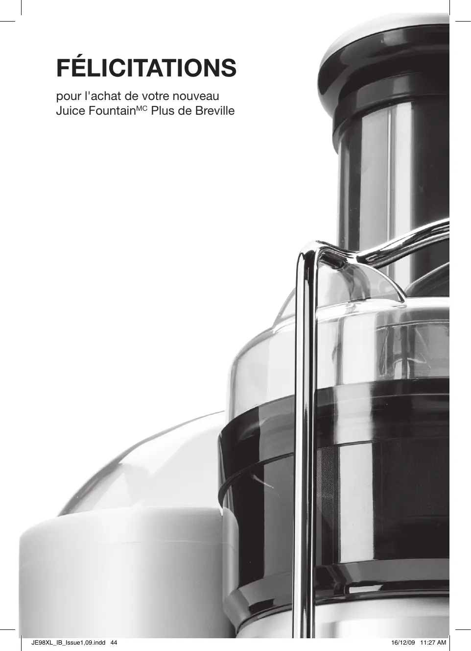 JE98XL_IB_Issue1,09.indd 55 16/12/09 11:27 AM Le fonctionnement de votre Juice FountainMC Plus de Breville JE98XL_IB_Issue1,09.indd 56 16/12/09 11:27 AM Le fonctionnement de votre JUICE FOUNTAINMC PLUS