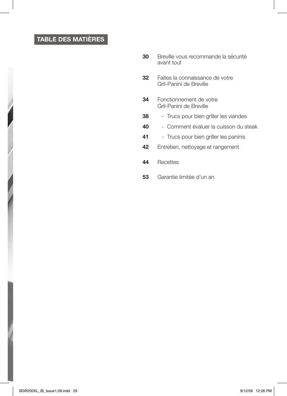 ai - Trucs pour bien griller les paninis 42 Entretien, nettoyage et rangement 44 Recettes 53 Garantie limitée d'un an BGR200XL_IB_Issue1,09.ndd 29 9/12/09 12:26 PM
