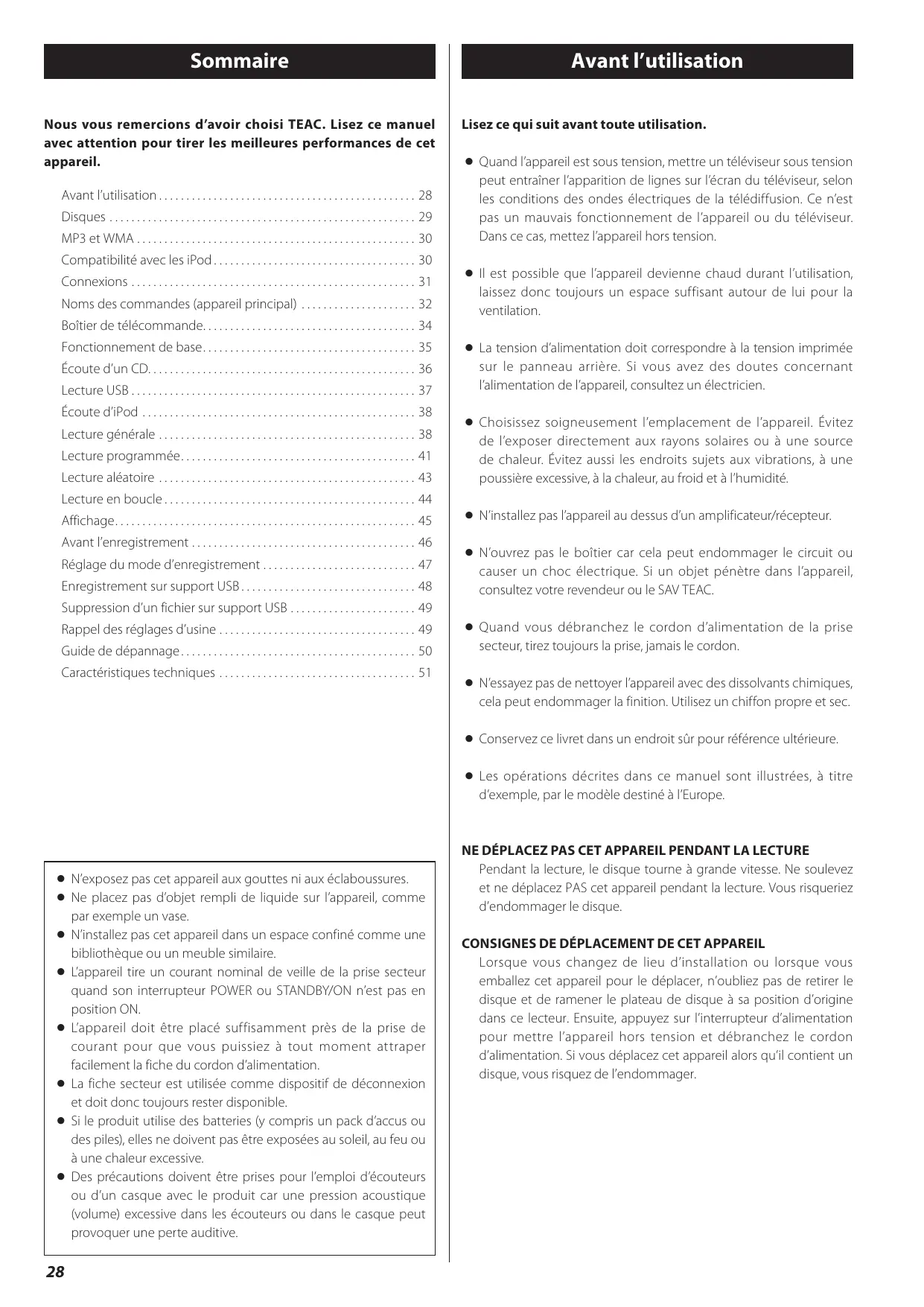- ENGLISH Sommaire Nous vous remercions d’avoir choisi TEAC. Lisez ce manuel avec attention pour tirer les meilleures performances de cet appareil. Avant l’utilisation p. 28