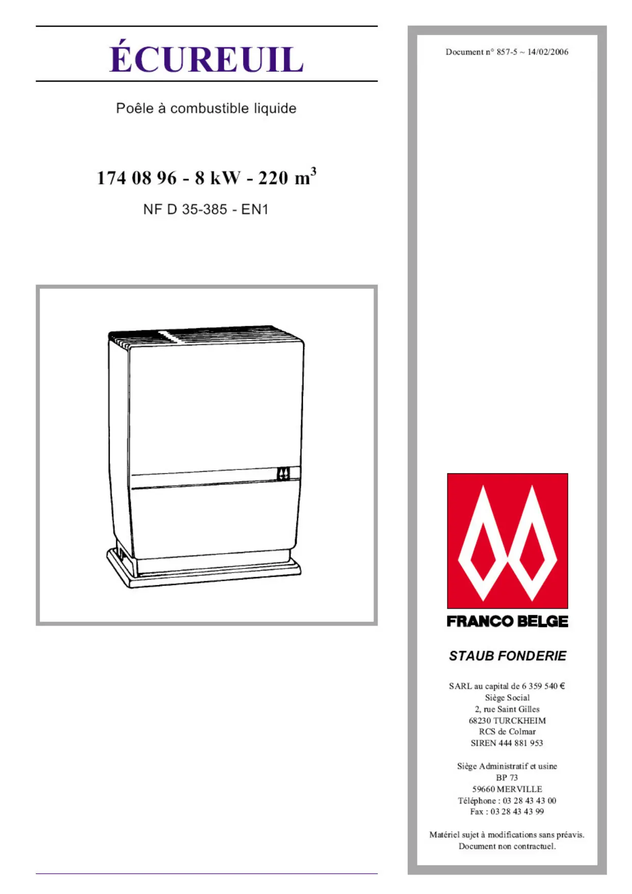 ÉCUREUIL pere Poêle à combustible liquide 174 08 96 - 8 kW - 220 m° NF D 35-385 - EN1 FRANCO BELGE STAUB FONDERIE SARL au capital de 6 359 540 € Siège Social 2, rue Saint Gilles 68230 TURCKHEIM RCS de Colmar SIREN 444 881 953 Siège Administratif et usine BP73 59660 MERVILLE Téléphone : 03 28 43 43 00 Fax : 03 28 43 43 99 Matériel sujet à modifications sans préavis. Document non contractuel.