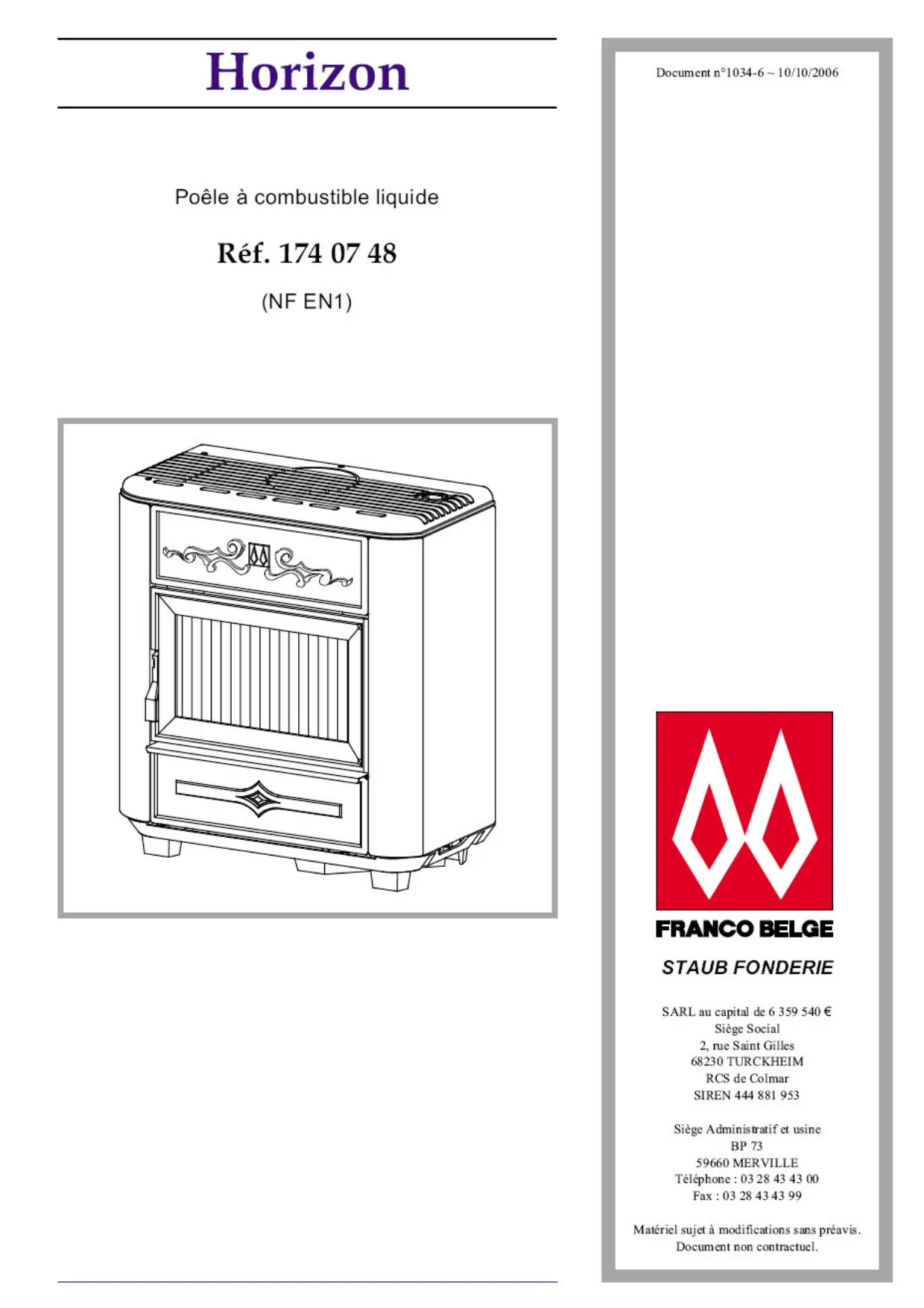 Horizon Document n°1034-6 - 10/10/2006 Poêle à combustible liquide Réf. 174 07 48 (NF EN‘) FRANCO BELGE STAUB FONDERIE SARL au capital de 6 359 540 € Siège Social 2, rue Saint Gilles 68230 TURCKHEIM RCS de Colmar SIREN 444 881 953 Siège Administratif et usine BP73 59660 MERVILLE Téléphone : 03 28 43 43 00 Fax : 03 28 43 43 99 Matériel sujet à modifications sans préavis. Document non contractuel.