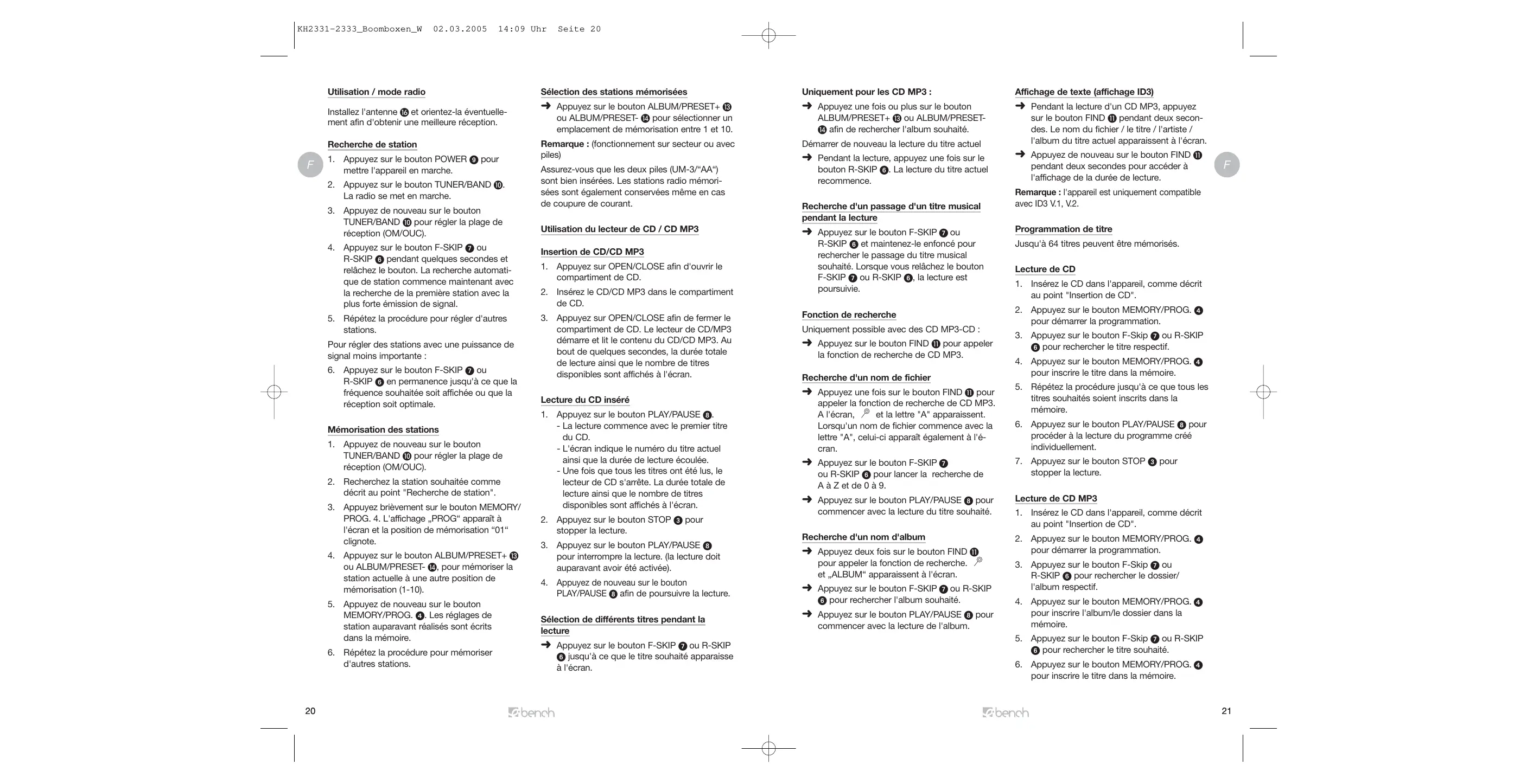 MODE D'EMPLOI 2333 PLL CD PLAYER WITH RADIO AND MP3 EBENCH