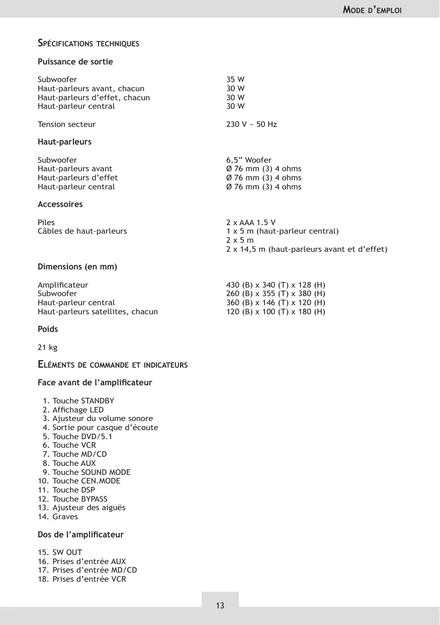 Tension secteur 230 V ~ 50 Hz Haut-parleurs Subwoofer Haut-parleurs avant Haut-parleurs d’effet Haut-parleur central Accessoires Piles Câbles de haut-parleurs