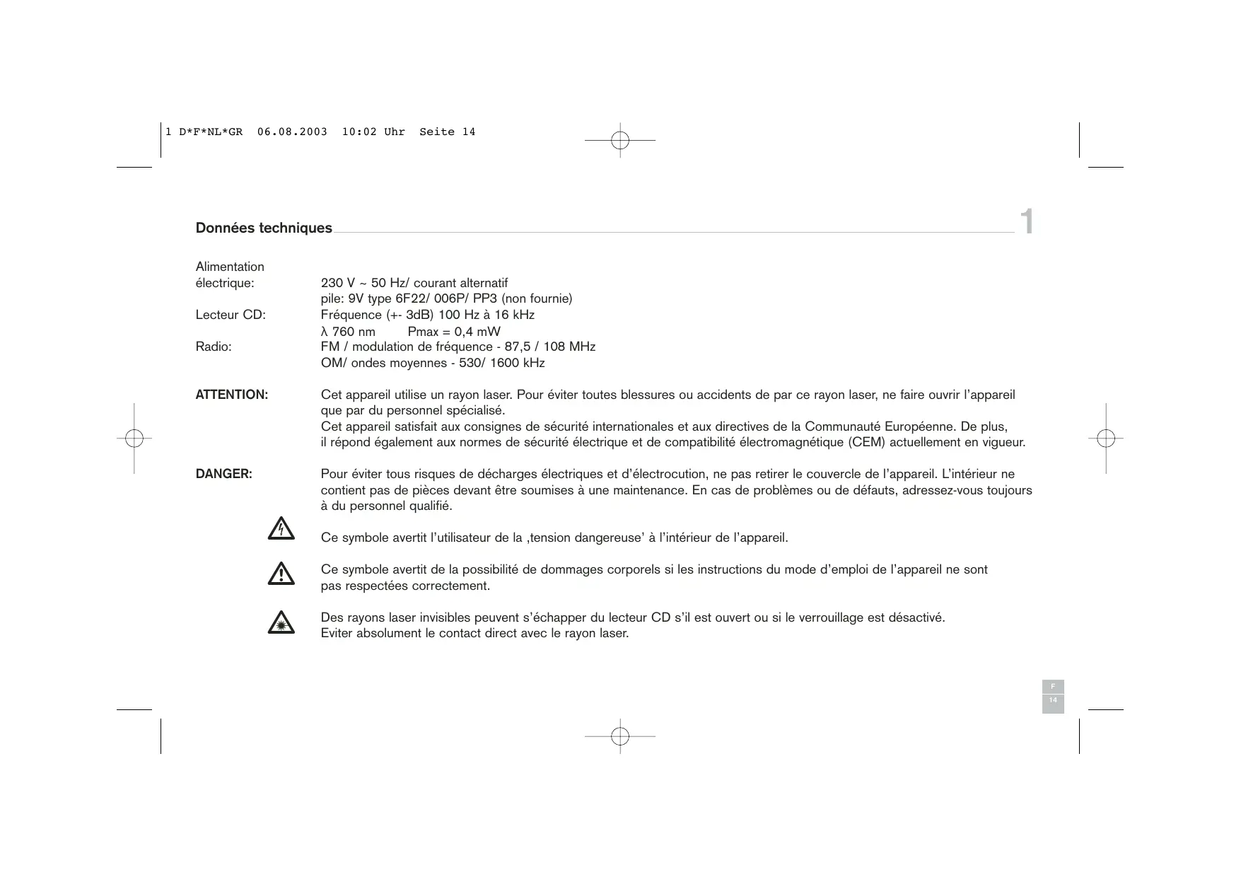 Cet appeareil utilise un rayon laser. Pour éviter toutes blessures ou accidents de par ce rayon laser, ne faire ouvrir l'appareil que par du personnel spécialisé.