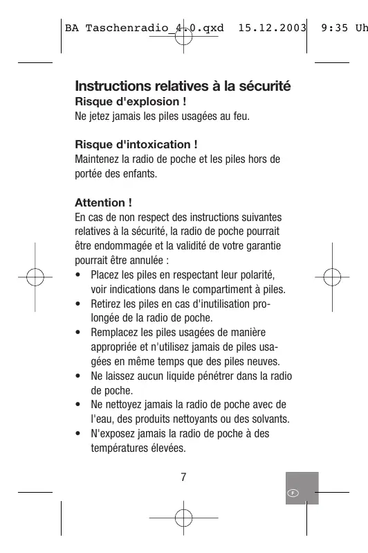 9:35 Uh BA Taschenradio ro 15.12.2003 Instructions relatives à la sécurité Risque d'explosion ! Ne jetez jamais les piles usagées au feu. Risque d'intoxication ! Maintenez la radio de poche et les piles hors de portée des enfants. Attention ! En cas de non respect des instructions suivantes relatives à la sécurité, la radio de poche pourrait être endommagée et la validité de votre garantie pourat être annulée : Placez les piles en respectant leur polarité, voir indications dans le compartiment à piles. + Retirez les piles en cas d'inutilisation pro- longée de la radio de poche. + Remplacez les piles usagées de manière appropriée et n'utilisez jamais de piles usa- gées en même temps que des piles neuves. + Ne laissez aucun liquide pénétrer dans la radio de poche. + Ne nettoyez jamais la radio de poche avec de l'eau, des produits nettoyants ou des solvants. + N'exposez jamais la radio de poche à des températures élevées.