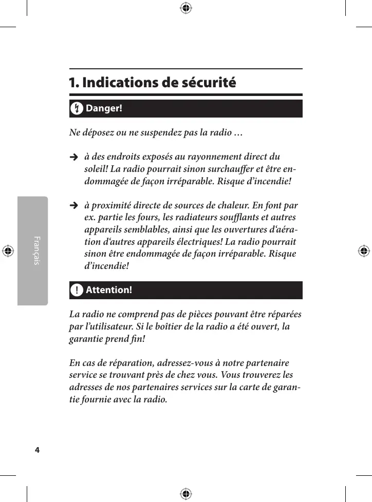 à des endroits exposés au rayonnement direct du soleil. La radio pourrait sinon surchauffer et être endommagée de façon irréparable. Risque d'incendie!