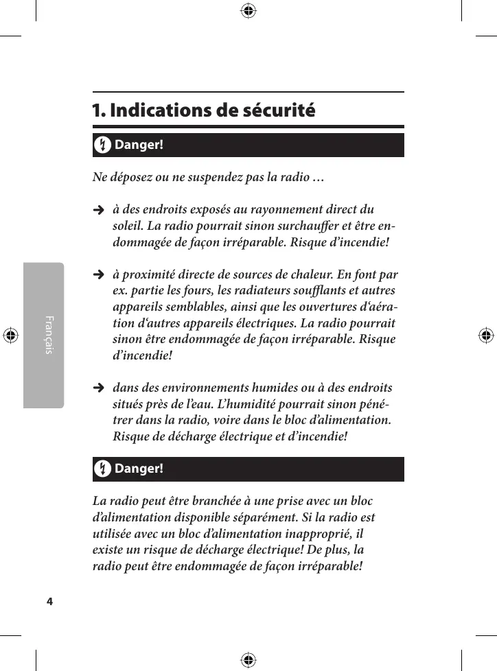 à proximité directe de sources de chaleur. En font par ex. partie les fours, les radiateurs soufflants et autres apparèilssemblables, ainsi que les ouvertures d'áération d'autres apparèils électriques. La radio pourrait sinon être endommagée de façon irréparable. Risque d'incendie!