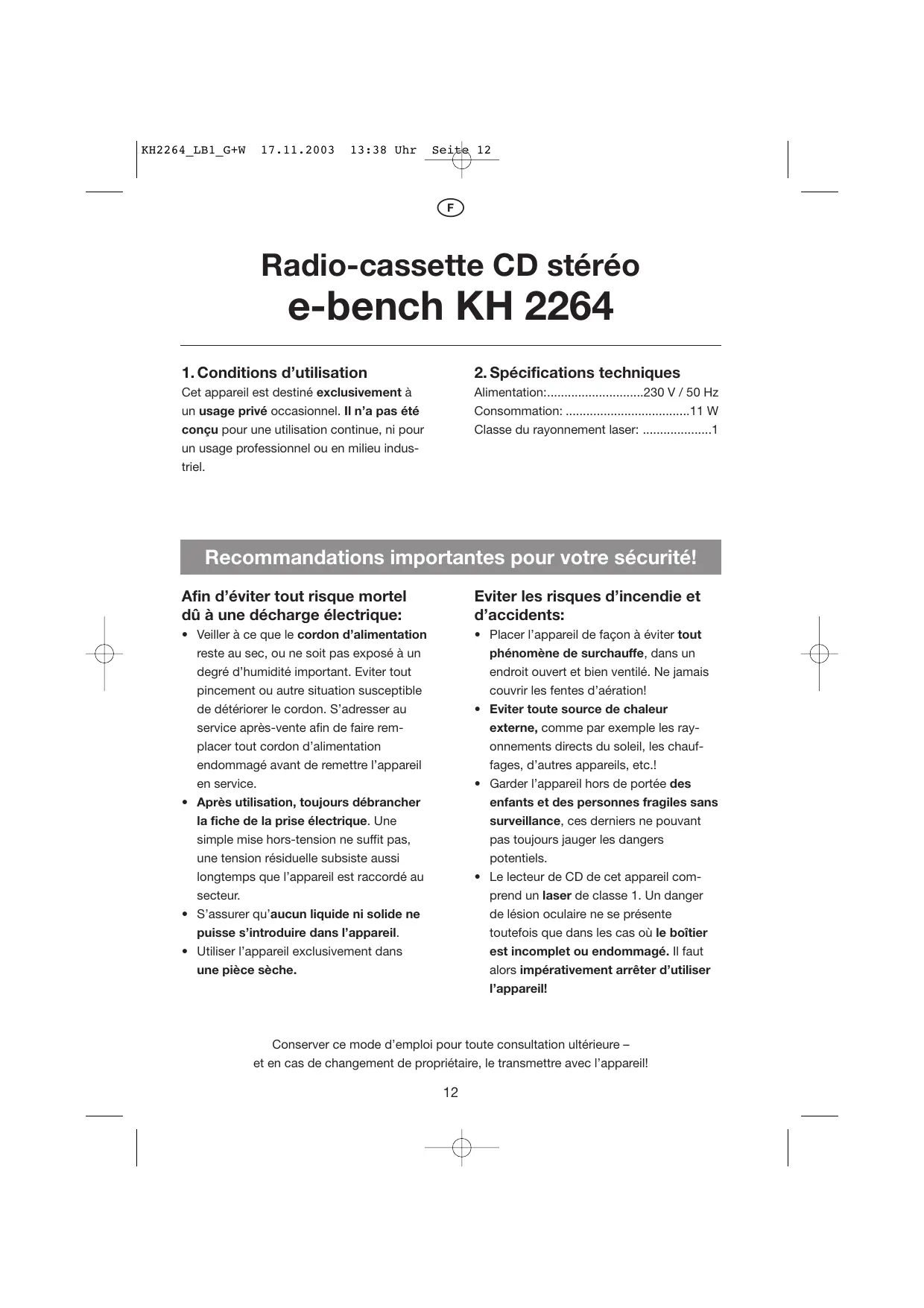 KH 2264 - Radio cassetteur EBENCH - Notice d'utilisation et mode d'emploi gratuit