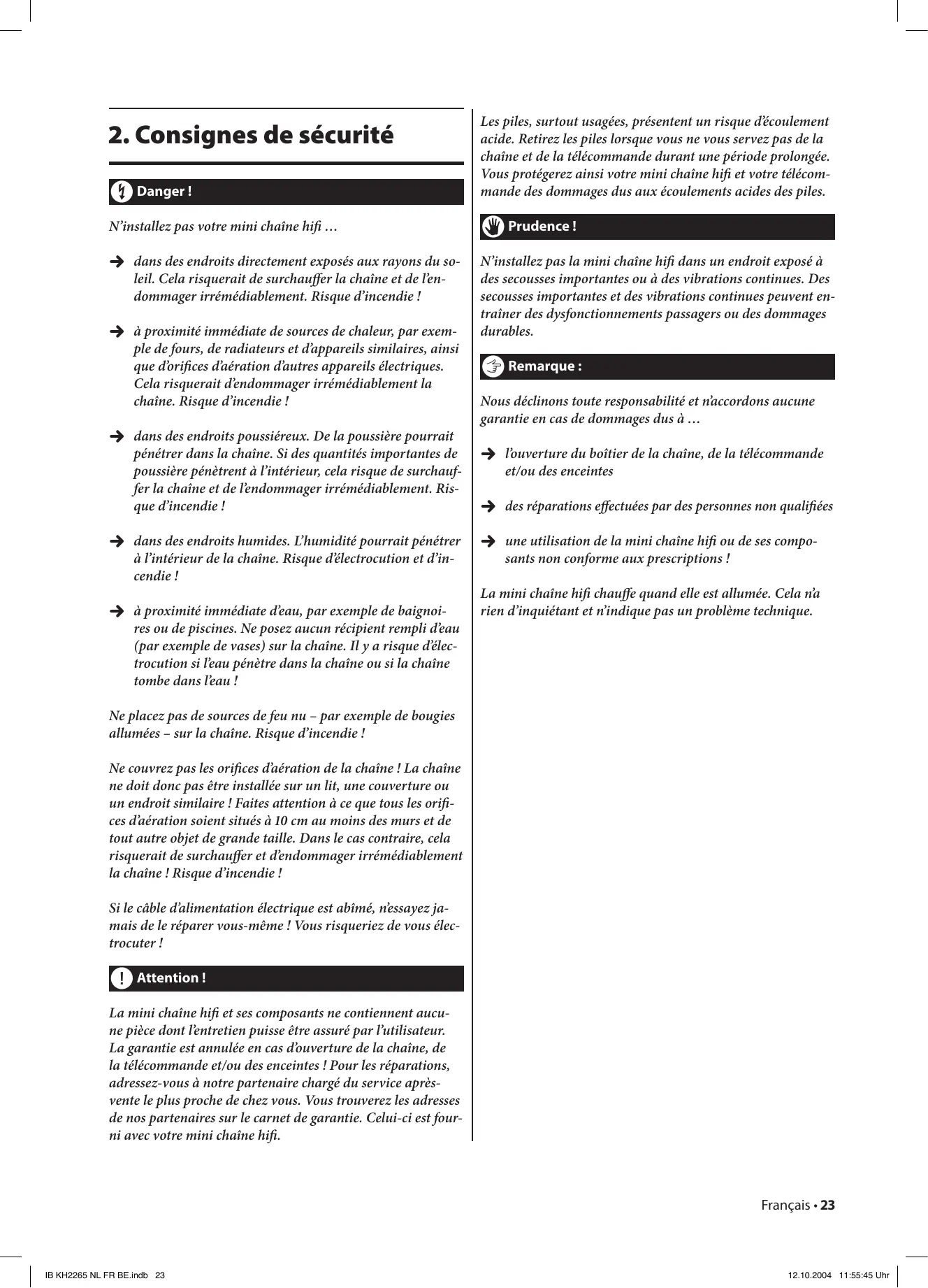 des réparations effectuées par des personnes non qualifiées une utilisation de la mini chaîne hifi ou de ses composants non conforme aux prescriptions ! La mini chaîne hifi chauffe quand elle est allumée. Cela n’a rien d’inquiétant et n’indique pas un problème technique. Ne placez pas de sources de feu nu – par exemple de bougies allumées – sur la chaîne. Risque d’incendie ! Ne couvrez pas les orifices d’aération de la chaîne ! La chaîne ne doit donc pas être installée sur un lit, une couverture ou un endroit similaire ! Faites attention à ce que tous les orifices d’aération soient situés à 10 cm au moins des murs et de tout autre objet de grande taille. Dans le cas contraire, cela risquerait de surchauffer et d’endommager irrémédiablement la chaîne ! Risque d’incendie ! Si le câble d’alimentation électrique est abîmé, n’essayez jamais de le réparer vous-même ! Vous risqueriez de vous électrocuter ! | Attention ! La mini chaîne hifi et ses composants ne contiennent aucune pièce dont l’entretien puisse être assuré par l’utilisateur. La garantie est annulée en cas d’ouverture de la chaîne, de la télécommande et/ou des enceintes ! Pour les réparations, adressez-vous à notre partenaire chargé du service aprèsvente le plus proche de chez vous. Vous trouverez les adresses de nos partenaires sur le carnet de garantie. Celui-ci est fourni avec votre mini chaîne hifi. Français • 23 IB KH2265 NL FR BE.indb 23