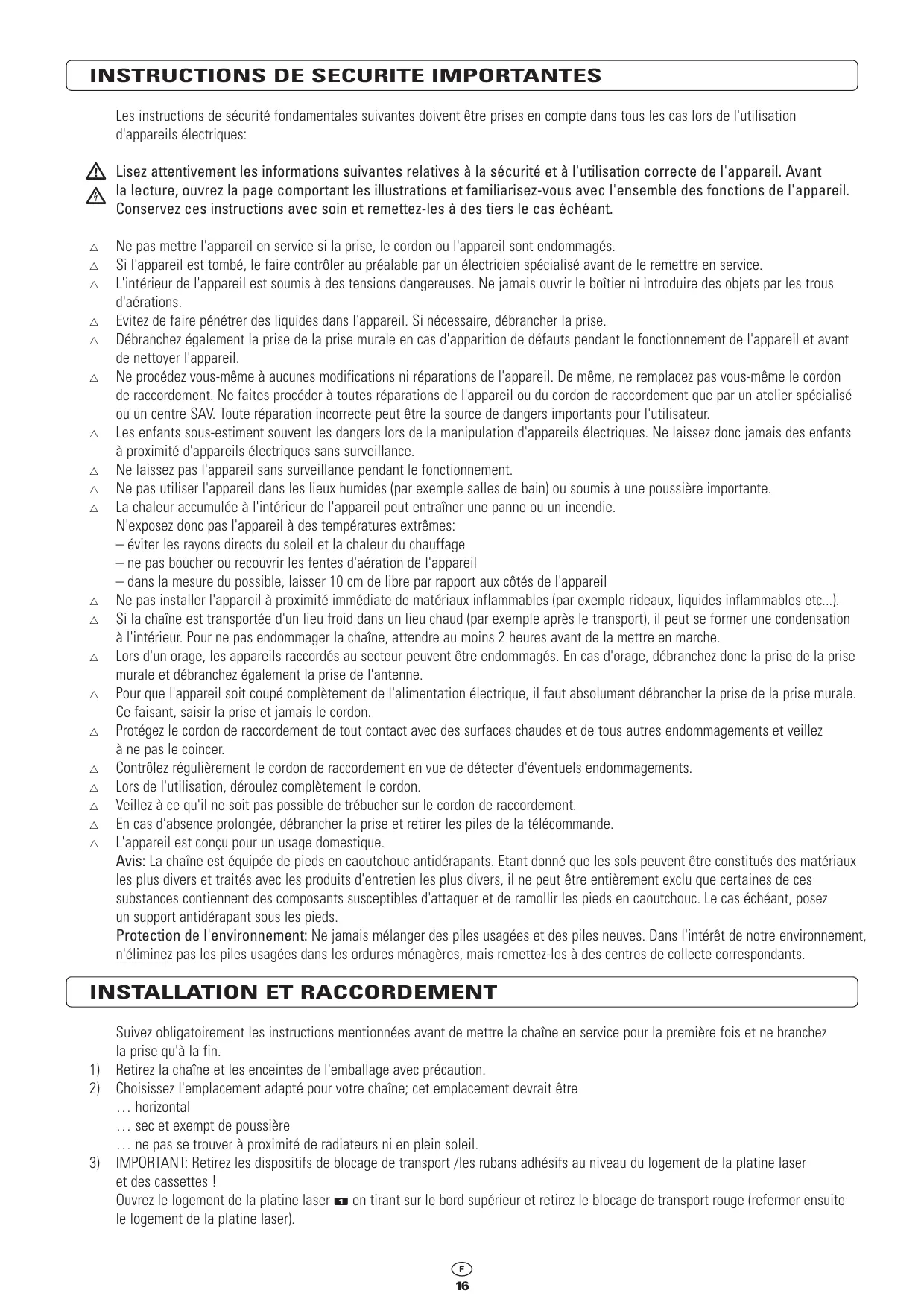 Conservez ces instructions avec soin et remettez-les à des tiers le cas échéant. Ne pas mettre l'appareil en service si la prise, le cordon ou l'appareil sont endommagés. Si l'appareil est tombé, le faire contrôler au préalable par un électricien spécialisé avant de le remettre en service. L'intérieur de l'appareil est soumis à des tensions dangereuses. Ne jamais ouvrir le boîtier ni introduire des objets par les trous d'aérations. Evitez de faire pénétrer des liquides dans l'appareil. Si nécessaire, débrancher la prise. Débranchez également la prise de la prise murale en cas d'apparition de défauts pendant le fonctionnement de l'appareil et avant de nettoyer l'appareil. Ne procédez vous-même à aucunes modifications ni réparations de l'appareil. De même, ne remplacez pas vous-même le cordon de raccordement. Ne faites procéder à toutes réparations de l'appareil ou du cordon de raccordement que par un atelier spécialisé ou un centre SAV. Toute réparation incorrecte peut être la source de dangers importants pour l'utilisateur. Les enfants sous-estiment souvent les dangers lors de la manipulation d'appareils électriques. Ne laissez donc jamais des enfants à proximité d'appareils électriques sans surveillance. Ne laissez pas l'appareil sans surveillance pendant le fonctionnement. Ne pas utiliser l'appareil dans les lieux humides (par exemple salles de bain) ou soumis à une poussière importante. La chaleur accumulée à l'intérieur de l'appareil peut entraîner une panne ou un incendie. N'exposez donc pas l'appareil à des températures extrêmes: – éviter les rayons directs du soleil et la chaleur du chauffage – ne pas boucher ou recouvrir les fentes d'aération de l'appareil – dans la mesure du possible, laisser 10 cm de libre par rapport aux côtés de l'appareil Ne pas installer l'appareil à proximité immédiate de matériaux inflammables (par exemple rideaux, liquides inflammables etc...). Si la chaîne est transportée d'un lieu froid dans un lieu chaud (par exemple après le transport), il peut se former une condensation à l'intérieur. Pour ne pas endommager la chaîne, attendre au moins 2 heures avant de la mettre en marche. Lors d'un orage, les appareils raccordés au secteur peuvent être endommagés. En cas d'orage, débranchez donc la prise de la prise murale et débranchez également la prise de l'antenne. Pour que l'appareil soit coupé complètement de l'alimentation électrique, il faut absolument débrancher la prise de la prise murale. Ce faisant, saisir la prise et jamais le cordon. Protégez le cordon de raccordement de tout contact avec des surfaces chaudes et de tous autres endommagements et veillez à ne pas le coincer. Contrôlez régulièrement le cordon de raccordement en vue de détecter d'éventuels endommagements. Lors de l'utilisation, déroulez complètement le cordon. Veillez à ce qu'il ne soit pas possible de trébucher sur le cordon de raccordement. En cas d'absence prolongée, débrancher la prise et retirer les piles de la télécommande. L'appareil est conçu pour un usage domestique. Avis: La chaîne est équipée de pieds en caoutchouc antidérapants. Etant donné que les sols peuvent être constitués des matériaux les plus divers et traités avec les produits d'entretien les plus divers, il ne peut être entièrement exclu que certaines de ces substances contiennent des composants susceptibles d'attaquer et de ramollir les pieds en caoutchouc. Le cas échéant, posez un support antidérapant sous les pieds. Protection de l'environnement: Ne jamais mélanger des piles usagées et des piles neuves. Dans l'intérêt de notre environnement, n'éliminez pas les piles usagées dans les ordures ménagères, mais remettez-les à des centres de collecte correspondants.