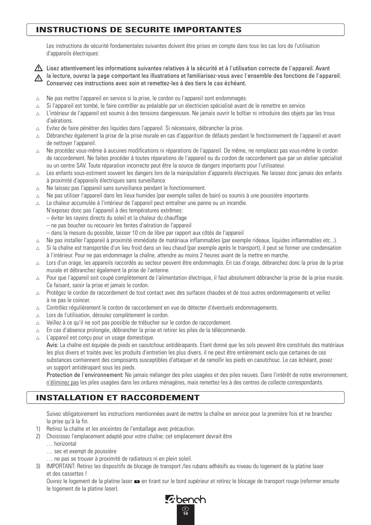 Suivez obligatoirement les instructions mentionnées avant de mettre la chaine en service pour la première fois et ne branche la prise qu'à la fin.