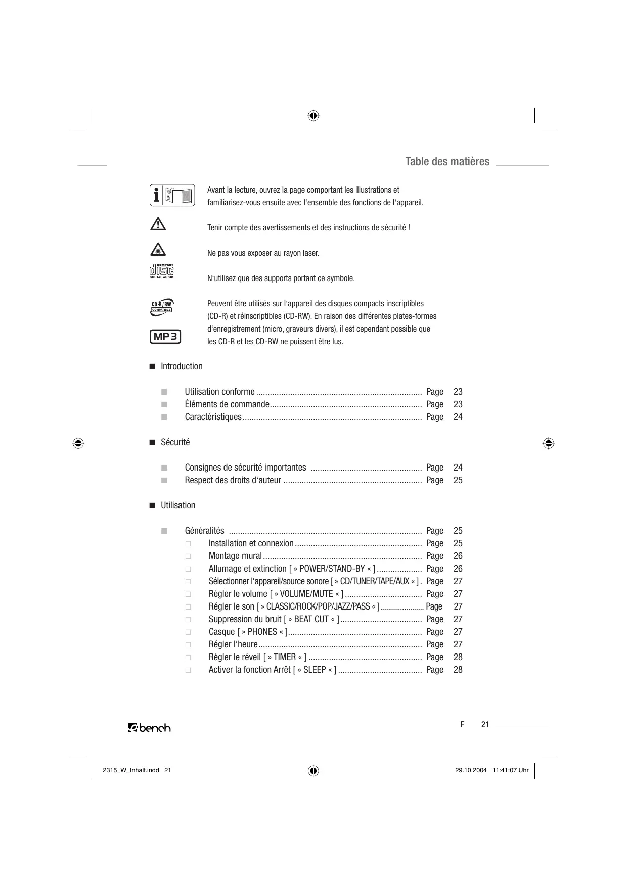Tenir compte des avertissements et des instructions de sécurité ! Ne pas vous exposer au rayon laser. N‘utilisez que des supports portant ce symbole. Peuvent être utilisés sur l‘appareil des disques compacts inscriptibles (CD-R) et réinscriptibles (CD-RW). En raison des différentes plates-formes d‘enregistrement (micro, graveurs divers), il est cependant possible que les CD-R et les CD-RW ne puissent être lus. MP 3 Introduction