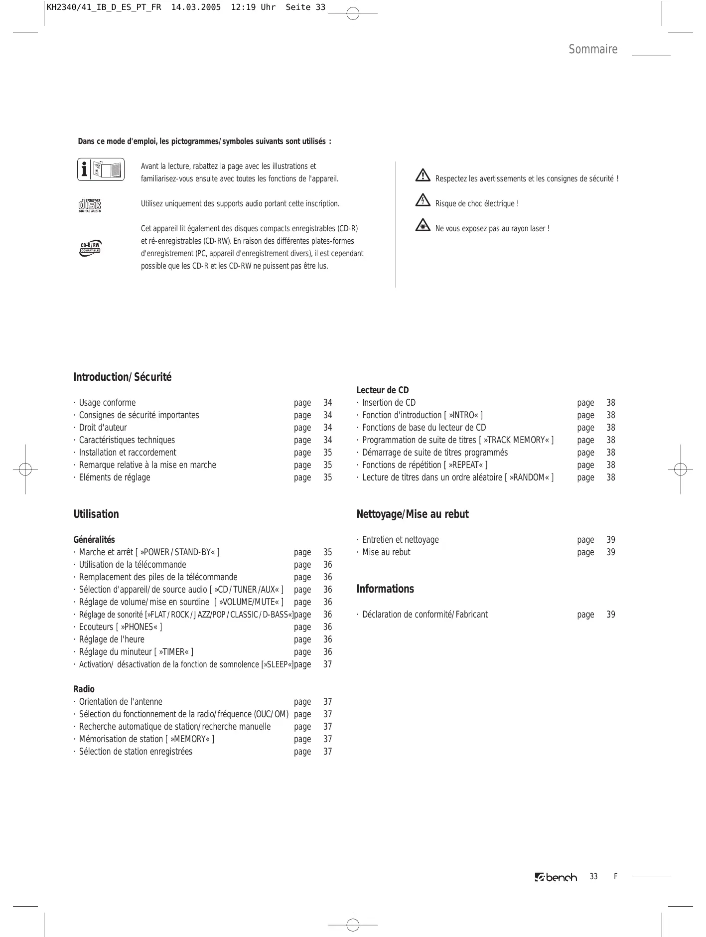 · Marche et arrêt [ »POWER / STAND-BY« ] page · Utilisation de la télécommande page · Remplacement des piles de la télécommande page · Sélection d'appareil/ de source audio [ »CD / TUNER /AUX« ] page · Réglage de volume/ mise en sourdine [ »VOLUME/MUTE« ] page · Réglage de sonorité [»FLAT / ROCK / JAZZ/POP / CLASSIC / D-BASS«]page · Ecouteurs [ »PHONES« ] page · Réglage de l'heure page · Réglage du minuteur [ »TIMER« ] page · Activation/ désactivation de la fonction de somnolence [»SLEEP«] page