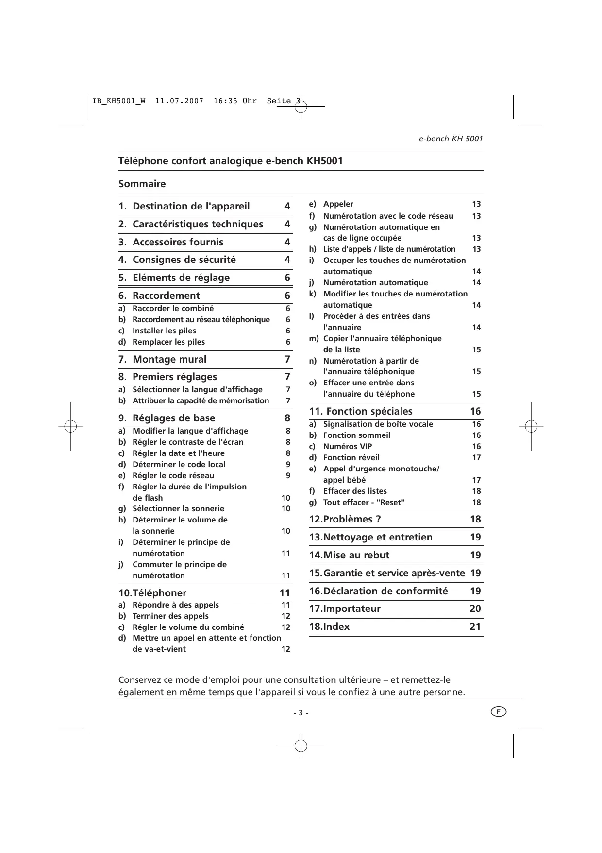 16:35 Uhr Seite 19 e-bench KH 5001 Si des dysfonctionnements se produisent malgré une exploitation précédente sans problème, vous pouvez éventuellement procéder à une réinitialisation complète de l'appareil (reset) - tout en pesant sciemment le pour et le contre.Si cette mesure ne conduit pas non plus à un résultat positif, il est recommandé de s'adresser au service après-vente et de laisser contrôler le téléphone. N'ouvrez pas le téléphone – il ne contient aucune pièce que vous puissiez utiliser, respectivement commander. De cette manière, le téléphone peu subir des dommages importants, et il perd de surcroît son autorisation de mise en service établie par les services des télécommunications.