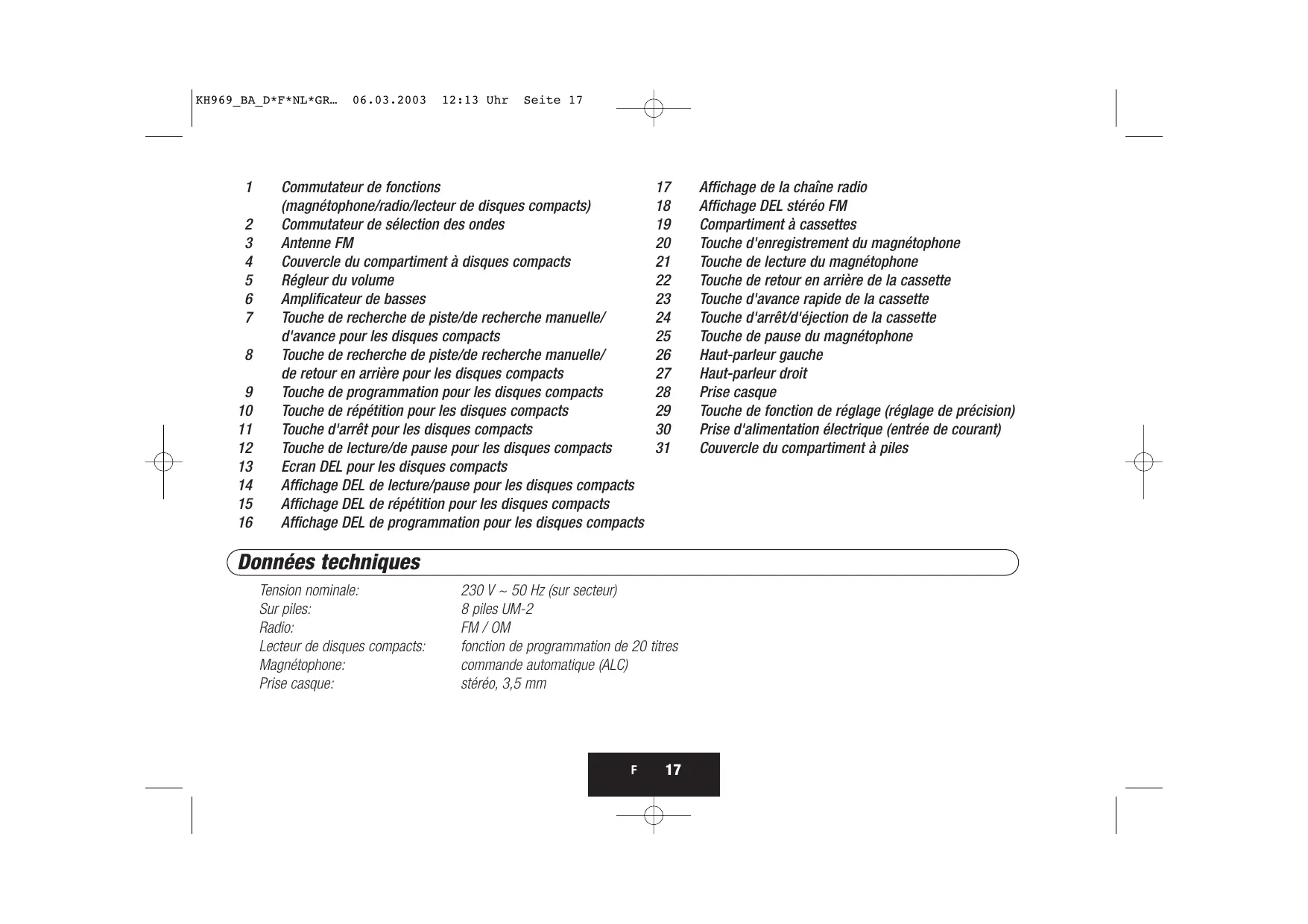 Données techniques Tension nominale: Sur piles: Radio: Lecteur de disques compacts: Magnétophone: Prise casque: 230 V ~ 50 Hz (sur secteur) 8 piles UM-2 FM / OM fonction de programmation de 20 titres commande automatique (ALC) stéréo, 3,5 mm