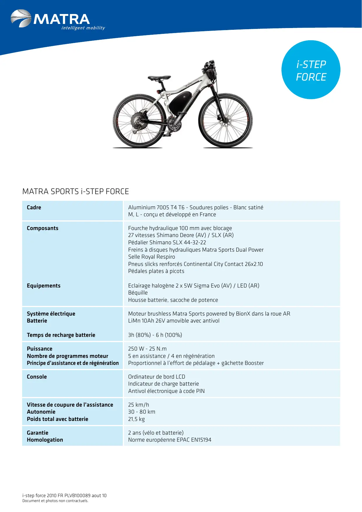 21,5 kg Garantie Homologation 2 ans (vélo et batterie) Norme européenne EPAC EN15194 i-step force 2010 FR PLVB100089 aout 10 Document et photos non contractuels.