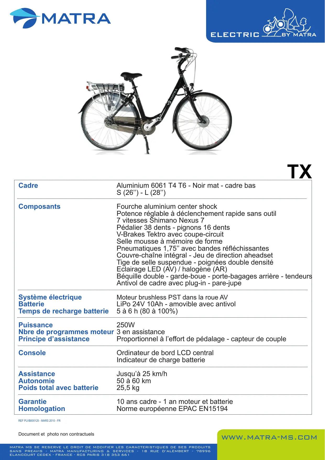 Cadre Aluminium 6061 T4 T6 - Noir mat - cadre bas S (26”)-L (28”) Composants Fourche aluminium center shock Potence réglable à déclenchement rapide sans outil 7 vitesses Shimano Nexus 7 Pédalier 38 dents - pignons 16 dents V-Brakes Tektro avec coupe-circuit Selle mousse à mémoire de forme Pneumatiques 1,75” avec bandes réfléchissantes Couvre-chaîne intégral - Jeu de direction aheadset Tige de selle suspendue - poignées double densité Eclairage LED (AV) / halogène (AR) Béquille double - garde-boue - porte-bagages arrière - tendeurs Antivol de cadre avec plug-in - pare-jupe Système électrique Batterie Temps de recharge batterie Moteur brushless PST dans la roue AV LiPo 24V 10Ah - amovible avec antivol 5à6h (80 à 100%) Puissance Nbre de programmes moteur Principe d'assistance 250W 3 en assistance Proportionnel à l'effort de pédalage - capteur de couple Console Ordinateur de bord LCD central Indicateur de charge batterie Assistance Jusqu'à 25 km/h Autonomie 50 à 60 km Poids total avec batterie 25,5 kg Garantie Homologation 10 ans cadre - 1 an moteur et batterie Norme européenne EPAC EN15194 REF PLVB000125 MARS 2010 FR. Document et photo non contractuels