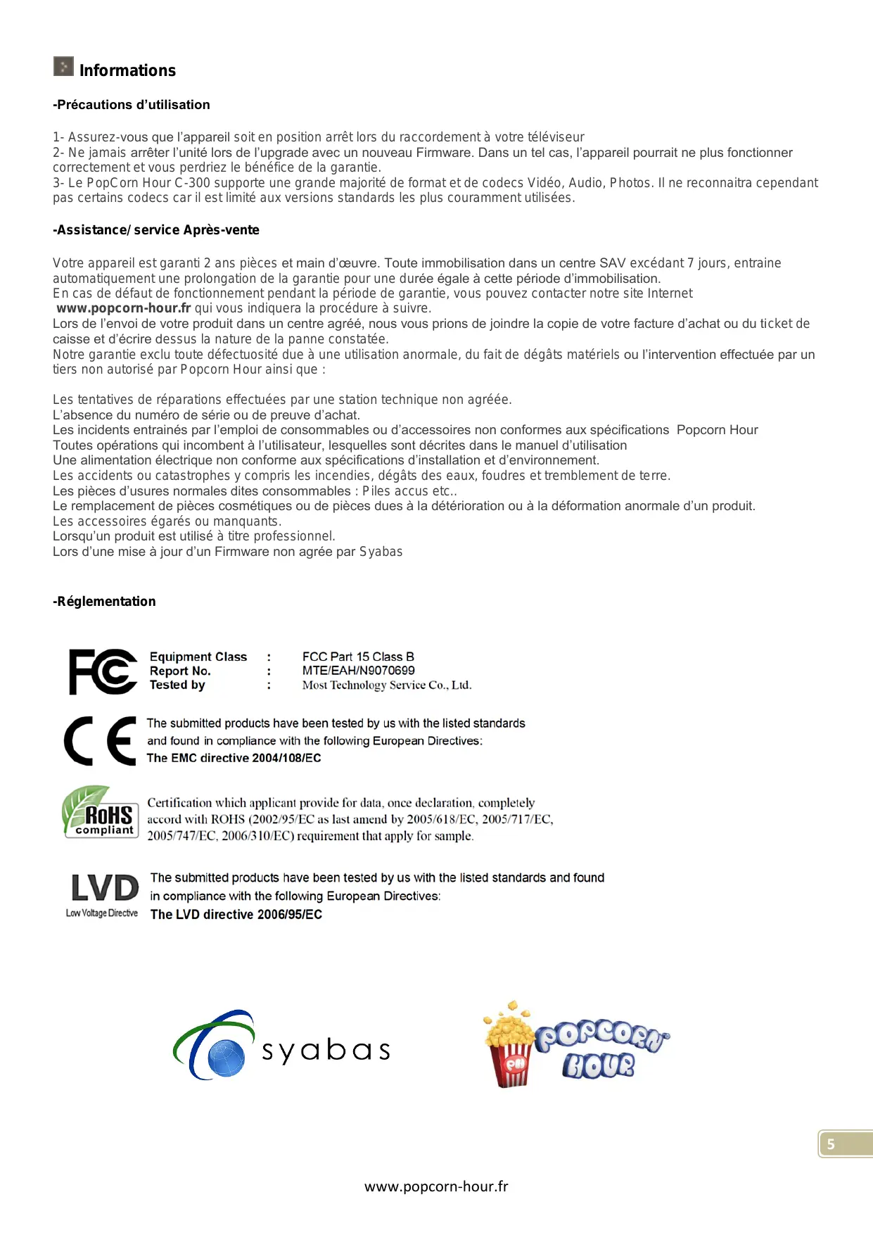 2- Ne jamais arrêter l’unité lors de l’upgrade avec un nouveau Firmware. Dans un tel cas, l’appareil pourrait ne plus fonctionner correctement et vous perdriez le bénéfice de la garantie. 3- Le PopCorn Hour C-300 supporte une grande majorité de format et de codecs Vidéo, Audio, Photos. Il ne reconnaitra cependant pas certains codecs car il est limité aux versions standards les plus couramment utilisées. -Assistance/ service Après-vente Votre appareil est garanti 2 ans pièces et main d’œuvre. Toute immobilisation dans un centre SAV excédant 7 jours, entraine automatiquement une prolongation de la garantie pour une durée égale à cette période d’immobilisation. En cas de défaut de fonctionnement pendant la période de garantie, vous pouvez contacter notre site Internet www.popcorn-hour.fr qui vous indiquera la procédure à suivre. Lors de l’envoi de votre produit dans un centre agréé, nous vous prions de joindre la copie de votre facture d’achat ou du ticket de caisse et d’écrire dessus la nature de la panne constatée. Notre garantie exclu toute défectuosité due à une utilisation anormale, du fait de dégâts matériels ou l’intervention effectuée par un tiers non autorisé par Popcorn Hour ainsi que : Les tentatives de réparations effectuées par une station technique non agréée. L’absence du numéro de série ou de preuve d’achat. Les incidents entrainés par l’emploi de consommables ou d’accessoires non conformes aux spécifications Popcorn Hour Toutes opérations qui incombent à l’utilisateur, lesquelles sont décrites dans le manuel d’utilisation Une alimentation électrique non conforme aux spécifications d’installation et d’environnement. Les accidents ou catastrophes y compris les incendies, dégâts des eaux, foudres et tremblement de terre. Les pièces d’usures normales dites consommables : Piles accus etc.. Le remplacement de pièces cosmétiques ou de pièces dues à la détérioration ou à la déformation anormale d’un produit. Les accessoires égarés ou manquants. Lorsqu’un produit est utilisé à titre professionnel. Lors d’une mise à jour d’un Firmware non agrée par Syabas -Réglementation