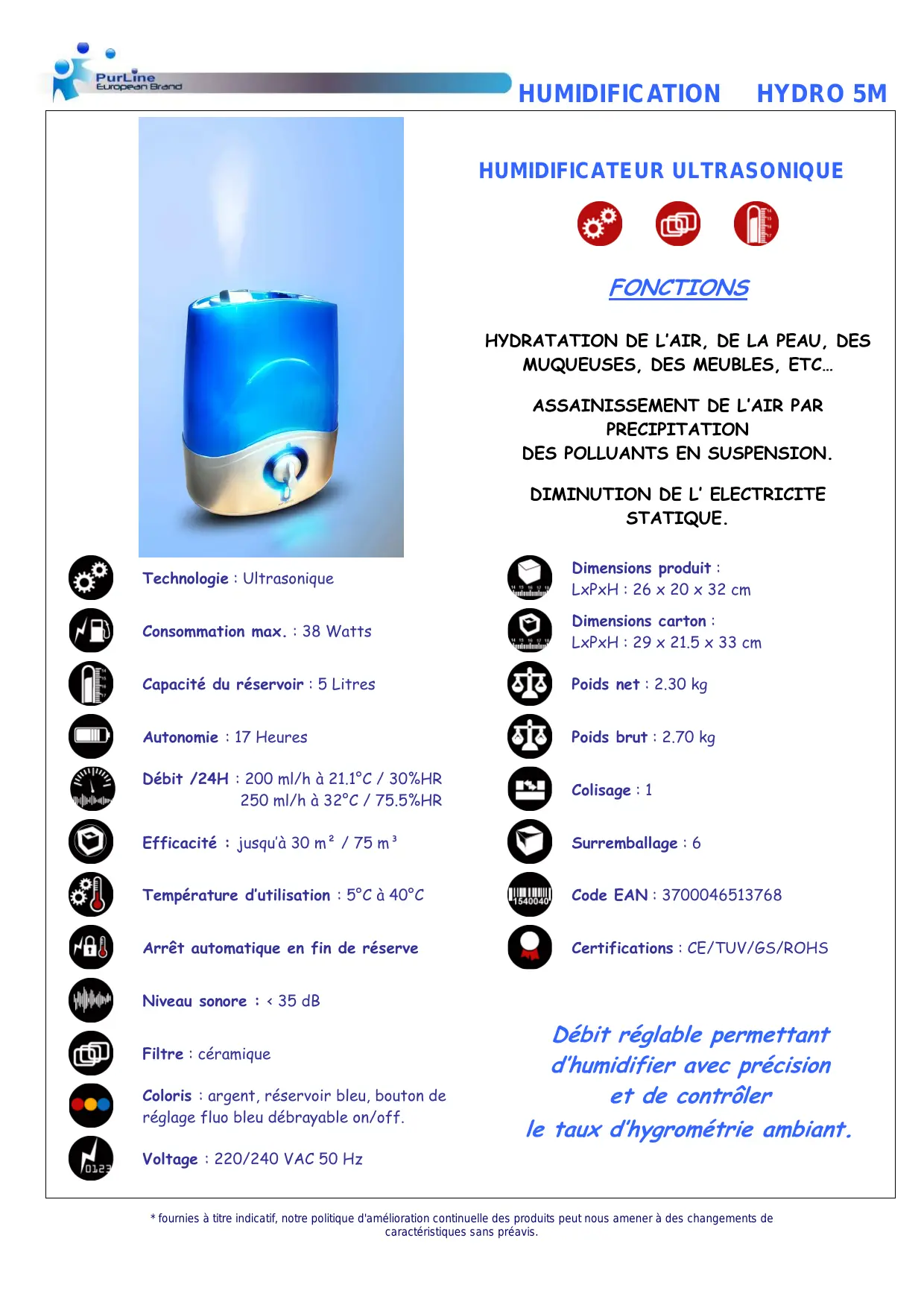 STATIQUE. Dimensions produit : LxPxH : 26 x 20 x 32 cm Technologie : Ultrasonique : . Dimensions carton : Consommation max. : 38 Watts LxPxH : 29 x 215 x 33 cm Capacité du réservoir : 5 Litres Poids net : 2.30 kg Autonomie : 17 Heures Poids brut : 2.70 kg Débit /24H : 200 ml/h à 21.1°C / 30%XHR 250 ml/h à 32°C / 75.5%HR Colisage : 1