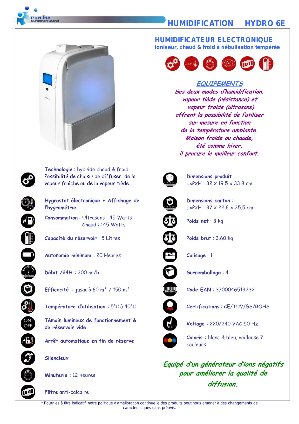 EQUIPEMENTS Ses deux modes d'humidification, vapeur tiède (résistance) et vapeur froide (ultrasons) offrent la possibilité de l'utiliser sur mesure en fonction de la température ambiante. Maison froide ou chaude, été comme hiver, l procure le meilleur confort. Dimensions produit : LxPxH : 32 x 19.5 x 33.8 cm Dimensions carton : EX LxPxH : 37 x 22.6 x 35.5 cm Poids net : 3 kg Poids brut : 3.60 kg Colisage : 1 Surremballage : 4 Code EAN : 3700046513232 Certifications : CE/TUV/GS/ROHS Voltage : 220/240 VAC 50 Hz Coloris : blanc & bleu, veilleuse 7 couleurs 68060866 © Equipé d'un générateur d'ions négatifs pour améliorer la qualité de diffusion. FFournies à ütre Indicatif, note politique d'amélioration contnuelle des produits peut nous amener à des changements de caractéristiques sans préavis.