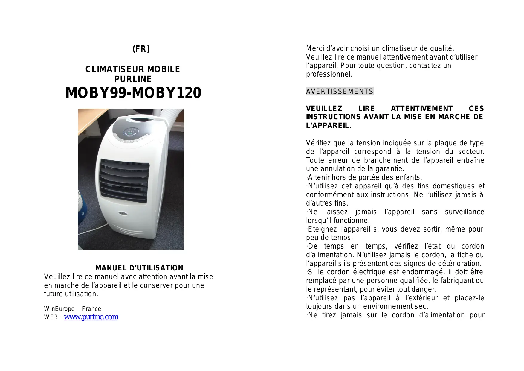 MOBY 99 - Climatiseur PUR LINE - Notice d'utilisation et mode d'emploi gratuit