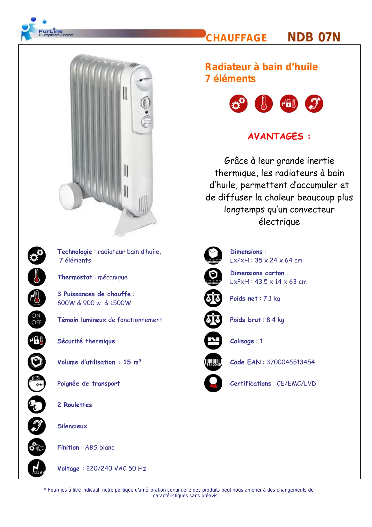 Technologie : radiateur bain d'huile, 7 éléments Thermostat : mécanique 3 Puissances de chauffe : 600W & 900 w & 1500W Témoin lumineux de fonctionnement Sécurité thermique Volume d'utilisation : 15 m° Poignée de transport 2 Roulettes Silencieux Finition : ABS blanc Voltage : 220/240 VAC 50 Hz Radiateur à bain d’huile 7 éléments