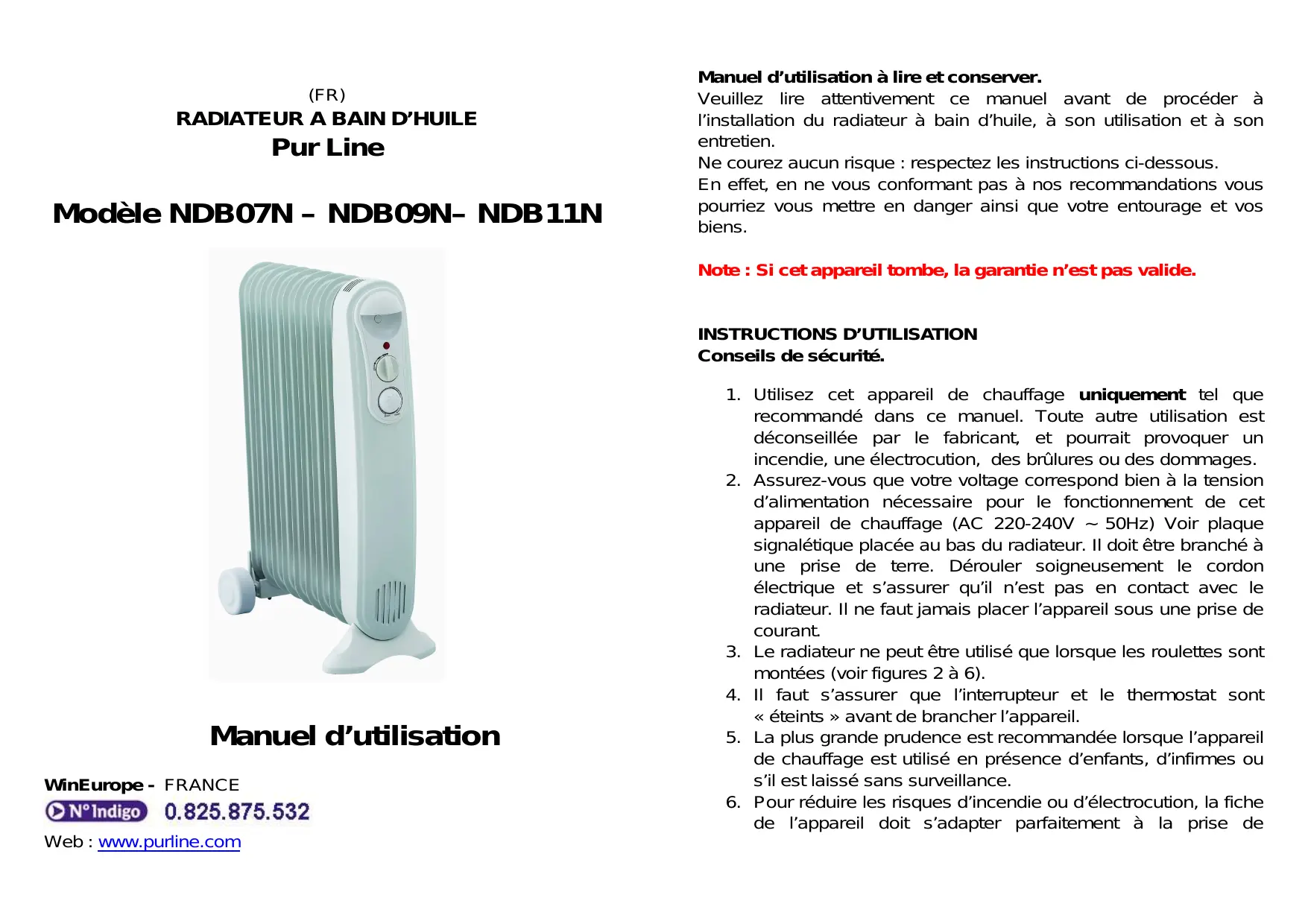 Conseils de sécurité. Manuel d’utilisation WinEurope - FRANCE Web : www.purline.com