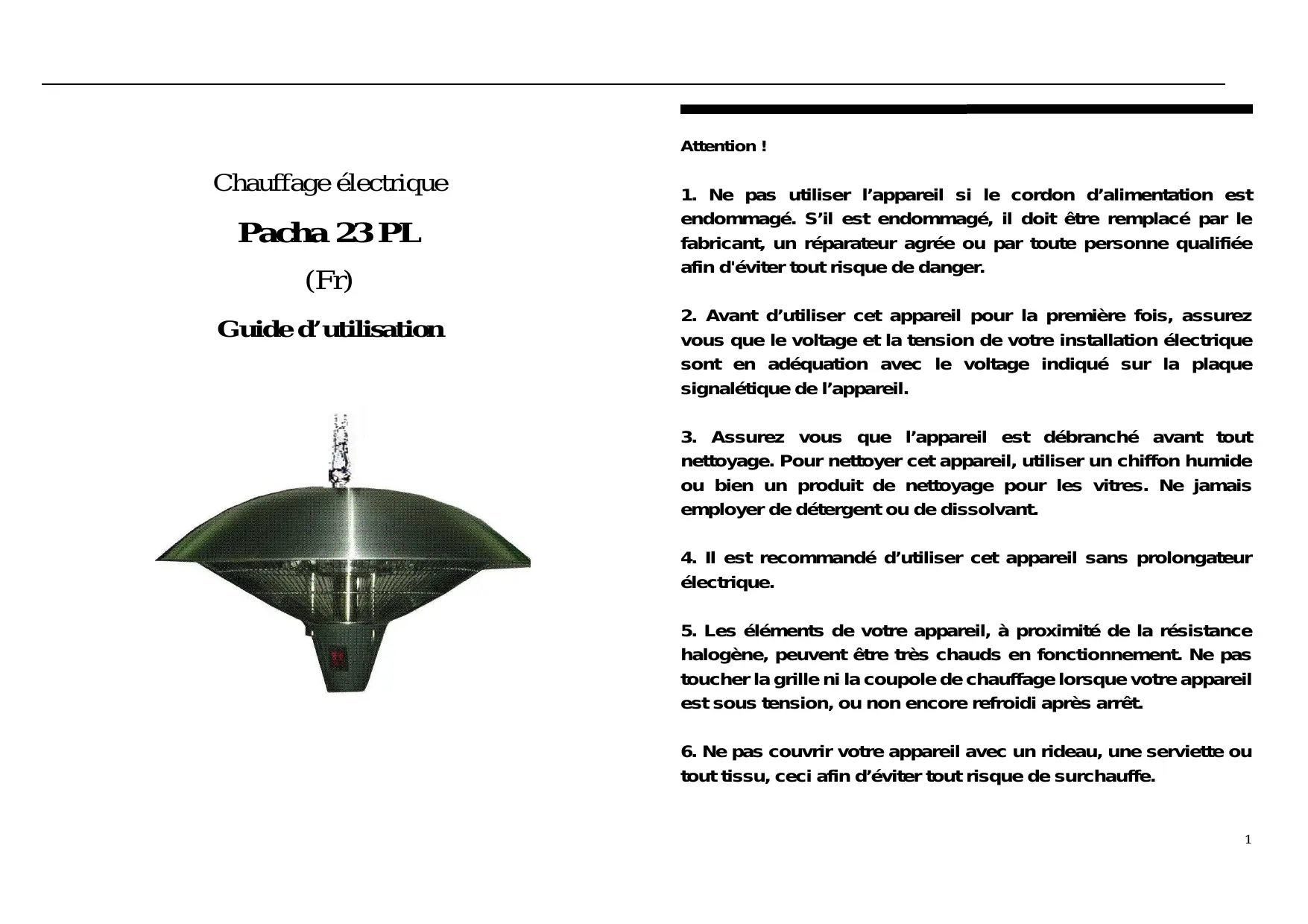 Attention ! Chauffage électrique Pacha 23 PL (Fr) Guide d’utilisation