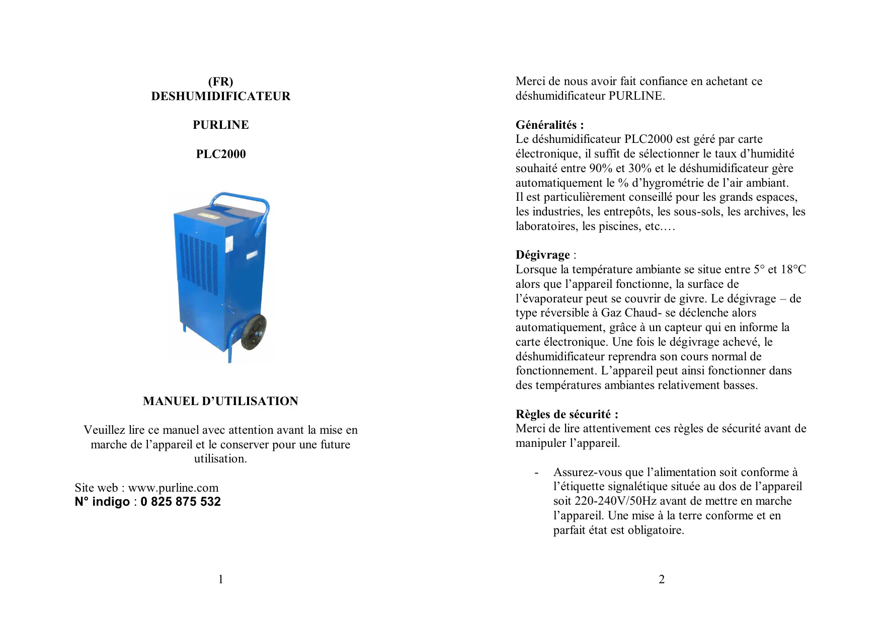 (EN) DEHUMIDIFIER Web : www.purline.com N° indigo : 0 825 875 532